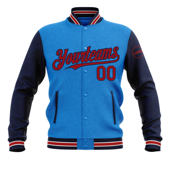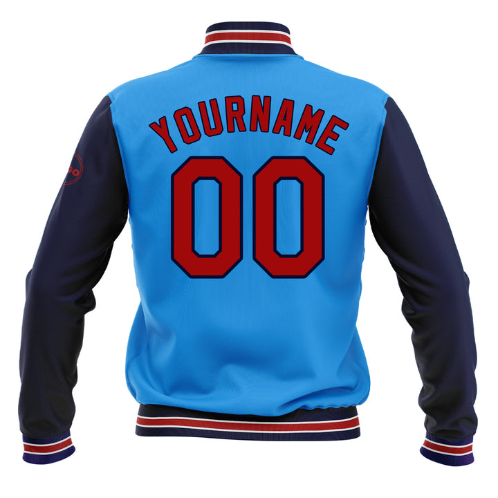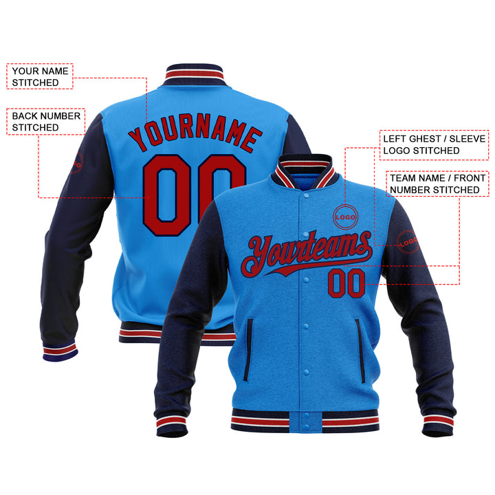 CCustom Powder Blue Red-Navy Classic Style Two Tone Bomber Varsity Letterman Embroidered Jacket