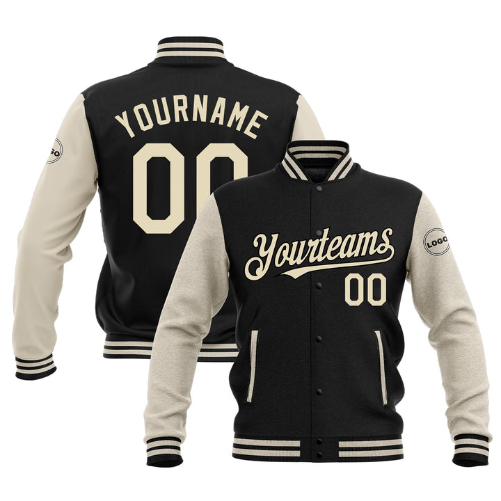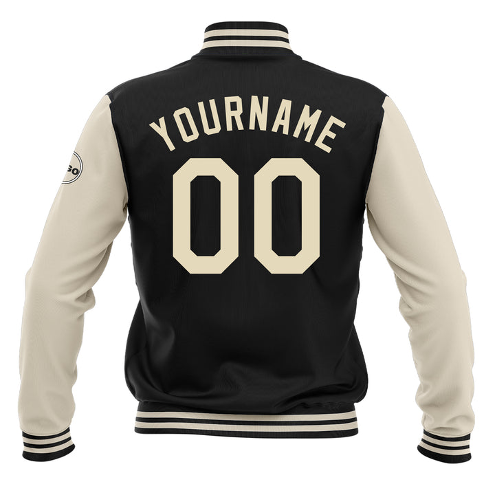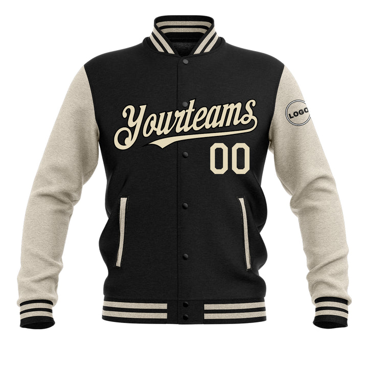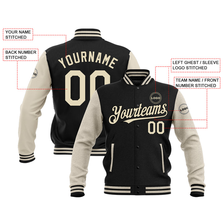 Custom Black Cream Classic Style Two Tone Full-Snap Bomber Varsity Letterman Embroidered Jacket