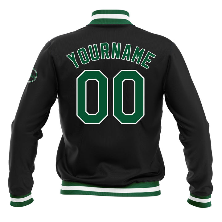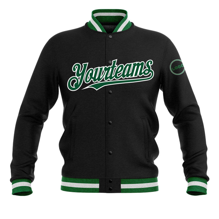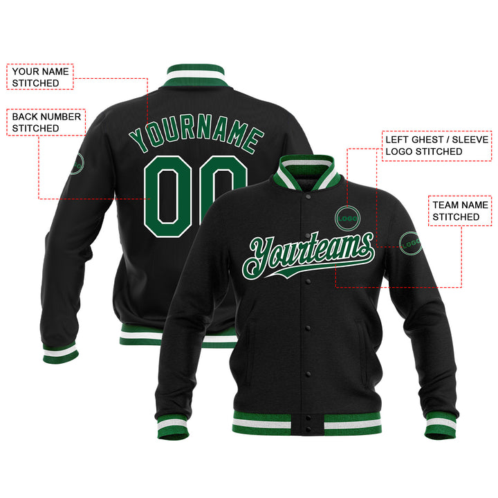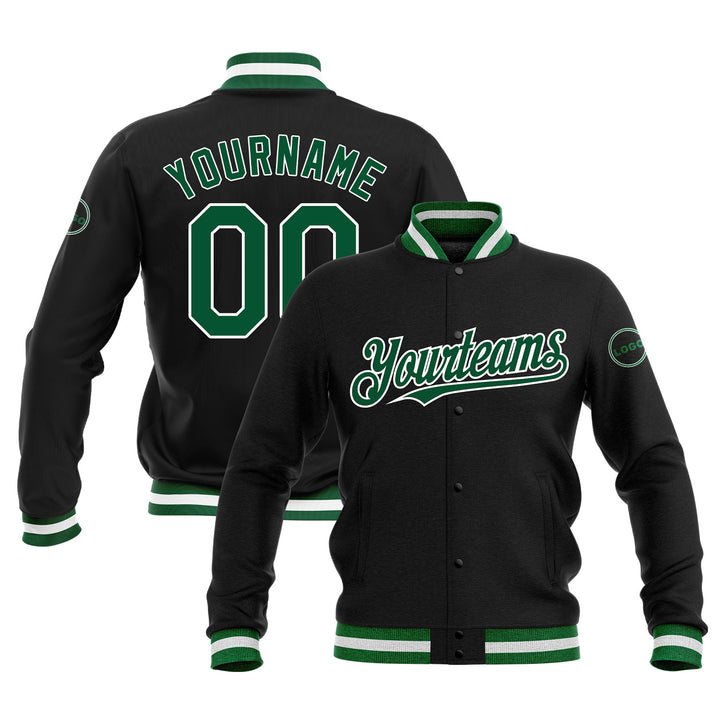 Custom Black Kelly Green-White Full-Snap Bomber Varsity Letterman Embroidered Jacket