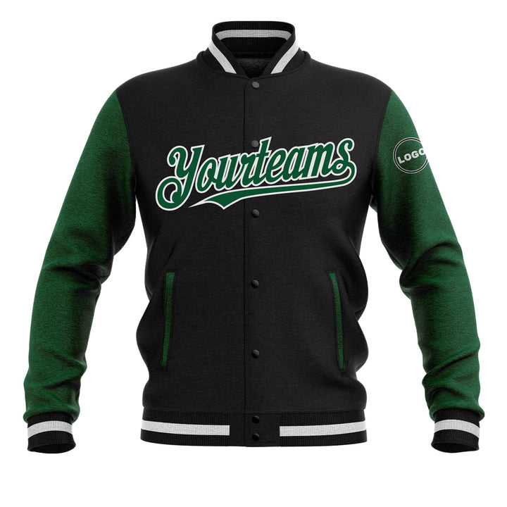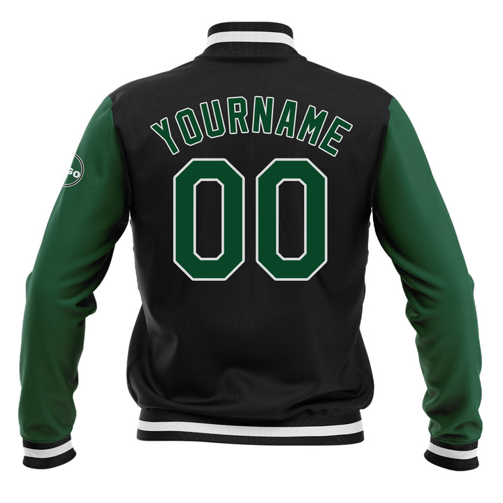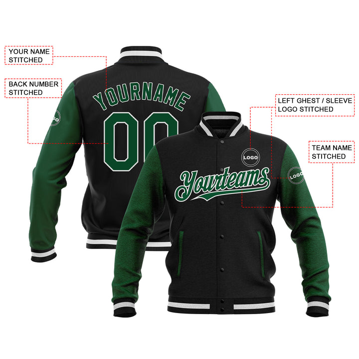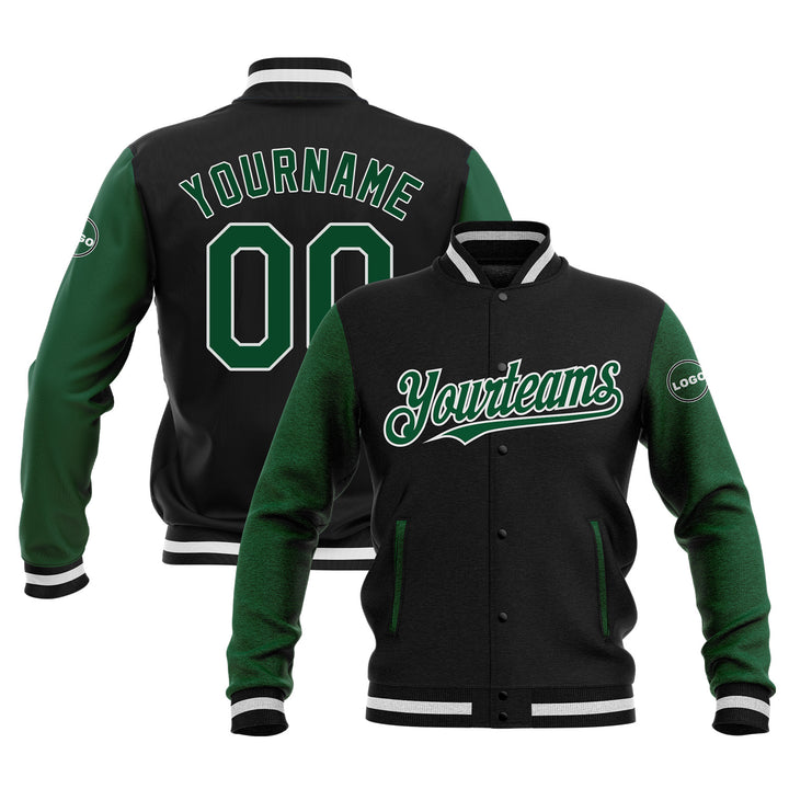 Custom Black Kelly Green-White Two Tone Full-Snap Bomber Varsity Letterman Embroidered Jacket