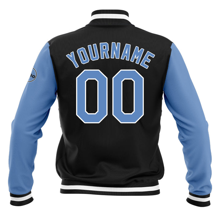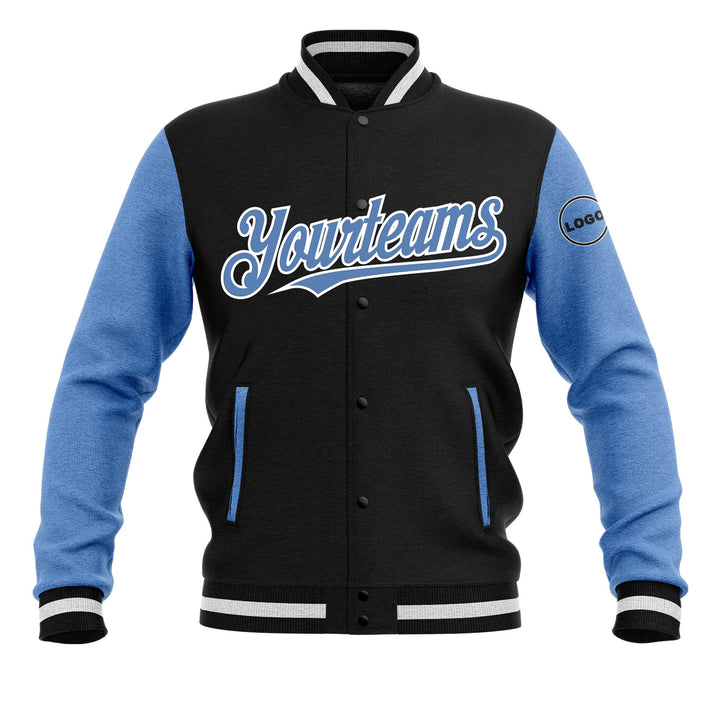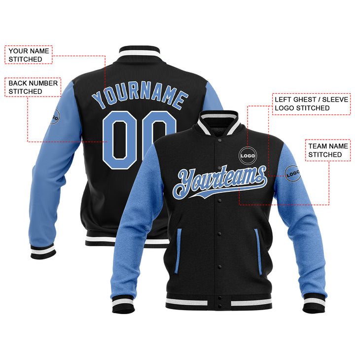 Custom Black Light Blue-White Two Tone Full-Snap Bomber Varsity Letterman Embroidered Jacket