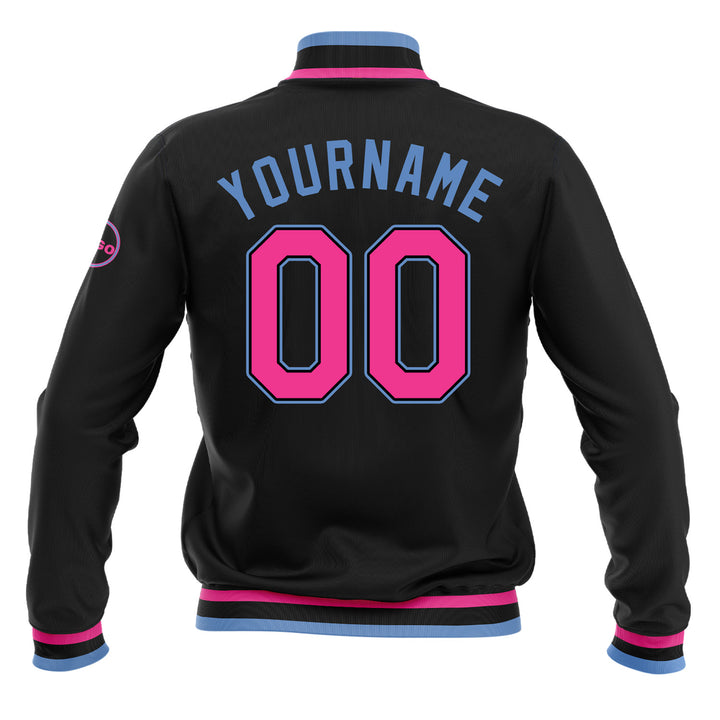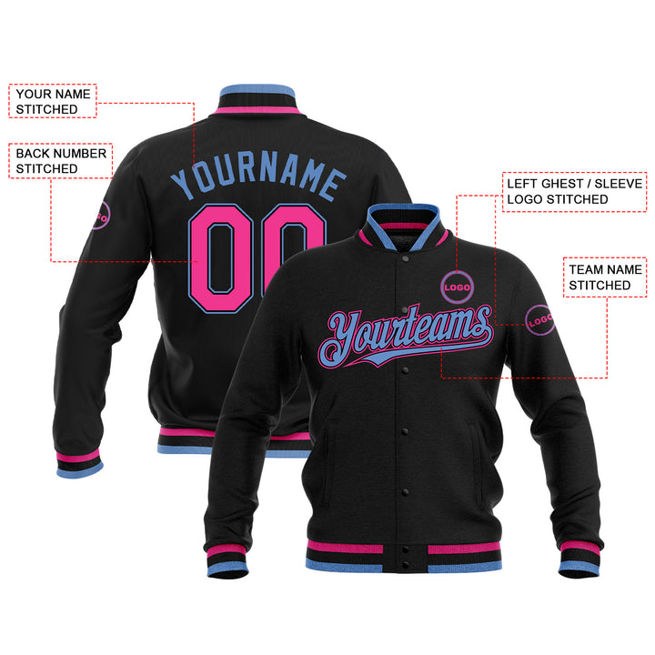 Custom Black Pink-Light Blue Full-Snap Bomber Varsity Letterman Embroidered Jacket