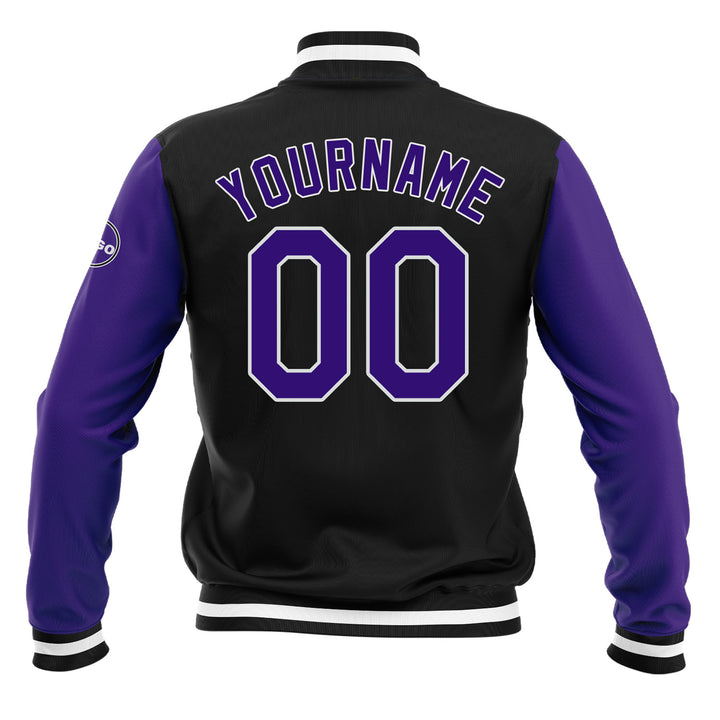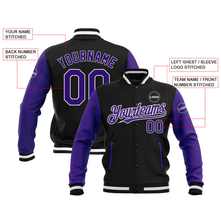 Custom Black Purple-White Classic Style Two Tone Full-Snap Bomber Varsity Letterman Embroidered Jacket