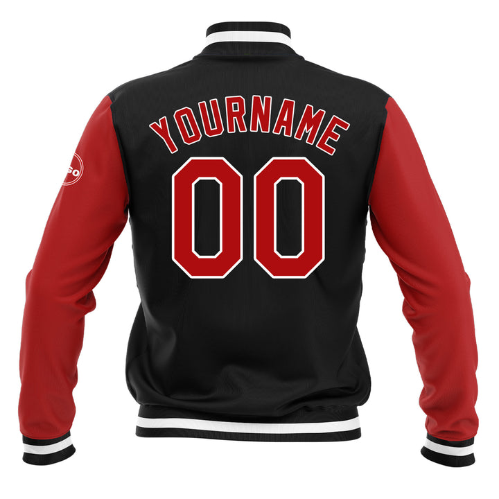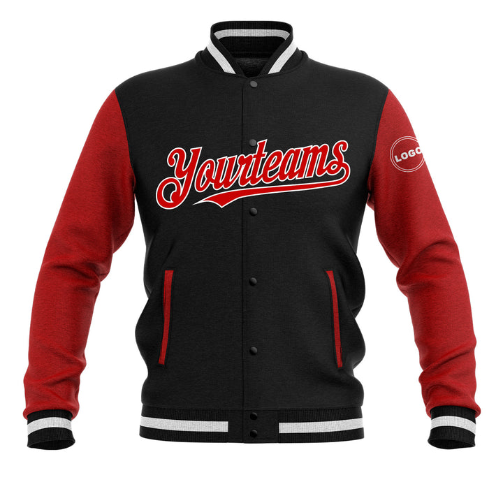 Custom Black Red-White Two Tone Full-Snap Bomber Varsity Letterman Embroidered Jacket
