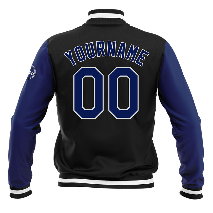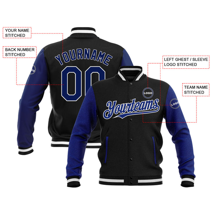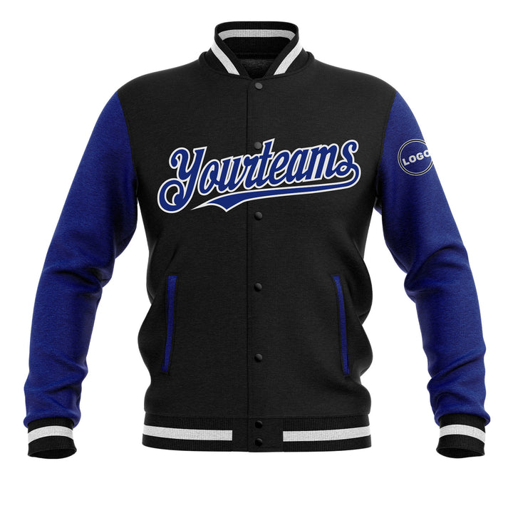 Custom Black Royal-White Two Tone Full-Snap Bomber Varsity Letterman Embroidered Jacket
