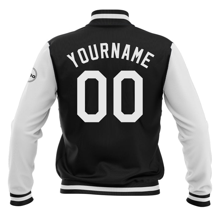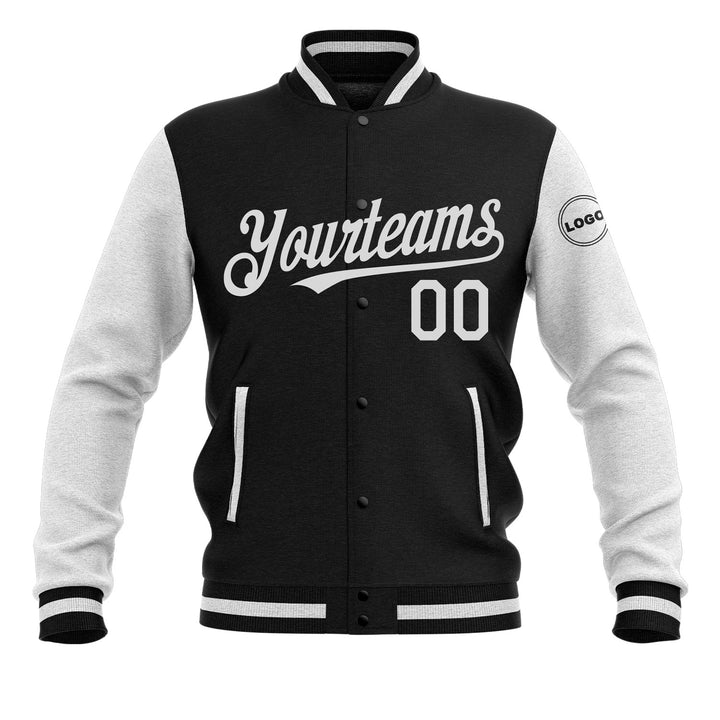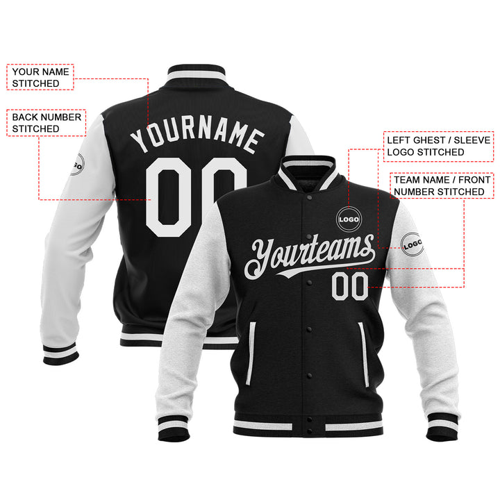 Custom Black White Classic Style Two Tone Full-Snap Bomber Varsity Letterman Embroidered Jacket