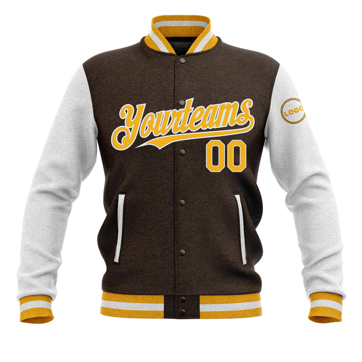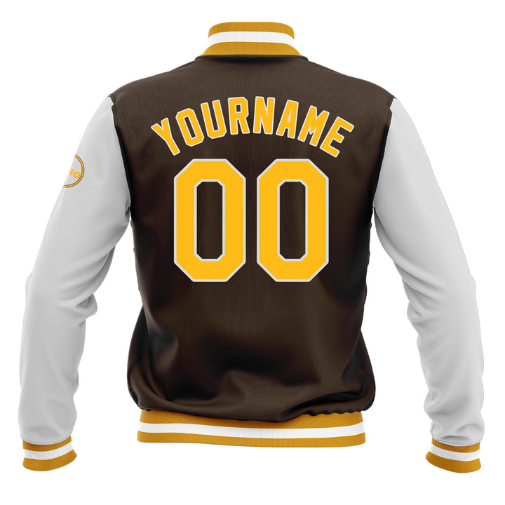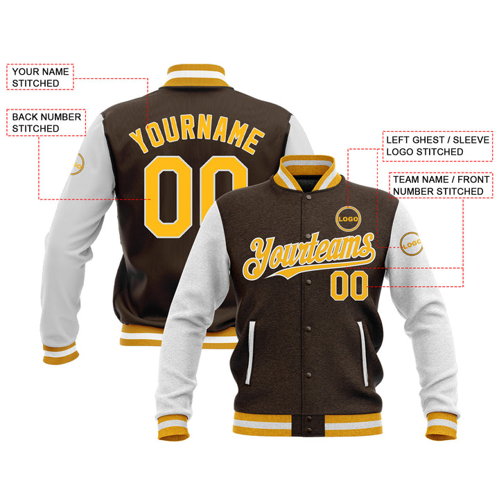 Custom Brown Gold-White Classic Style Two Tone Full-Snap Bomber Varsity Letterman Embroidered Jacket