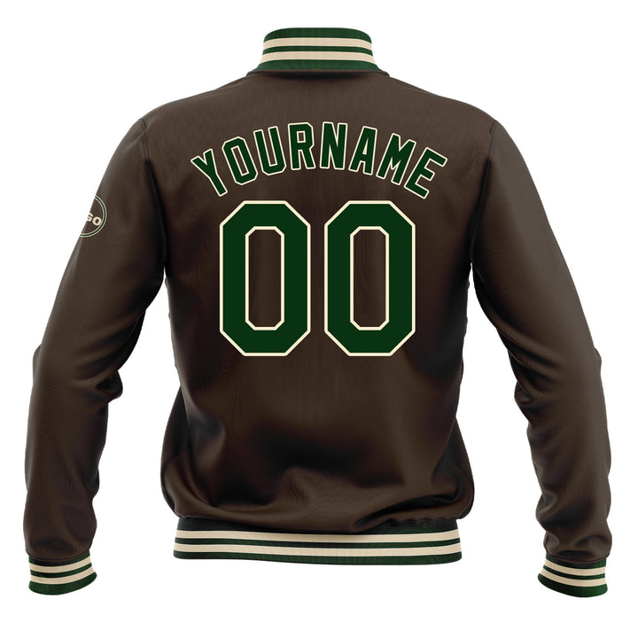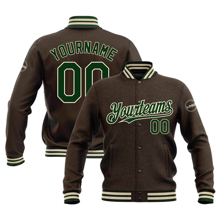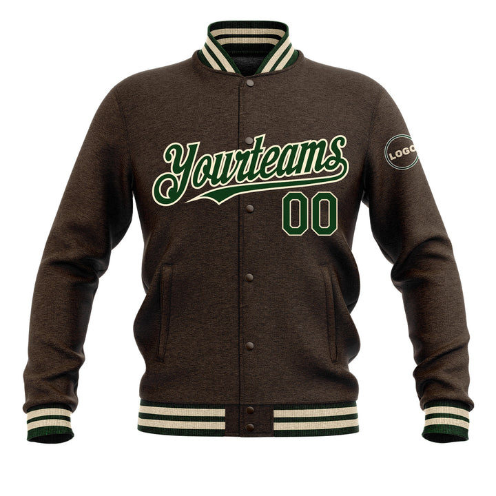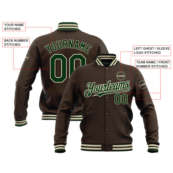 Custom Brown Green-Cream Classic Style Full-Snap Bomber Varsity Letterman Embroidered Jacket
