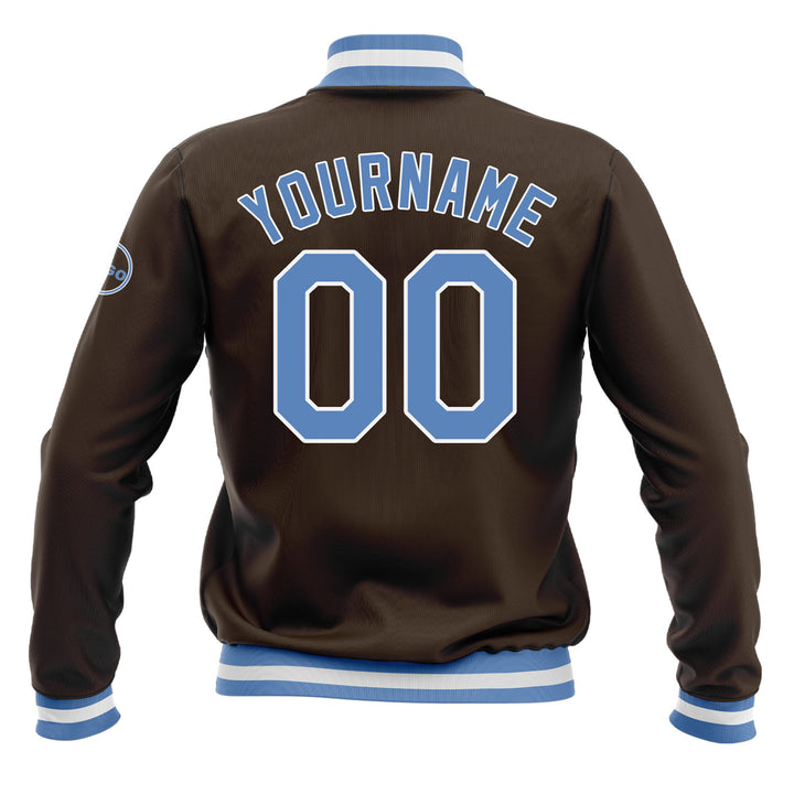 Custom Brown Light Blue-White Classic Style Full-Snap Bomber Varsity Letterman Embroidered Jacket