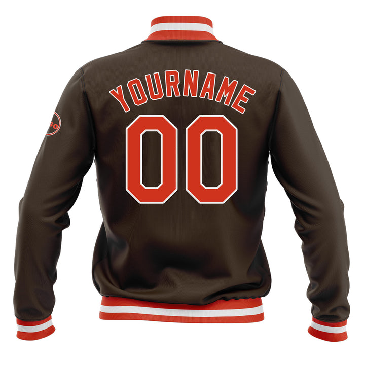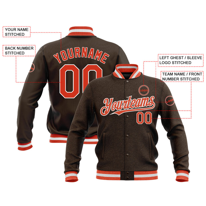 Custom Brown Orange-White Classic Style Full-Snap Bomber Varsity Letterman Embroidered Jacket