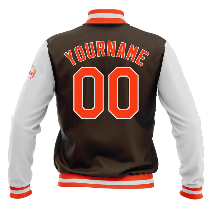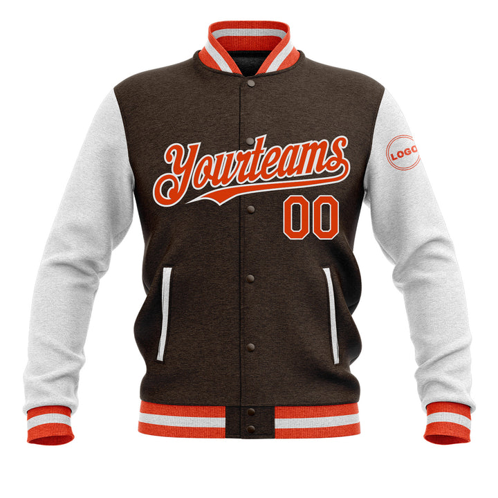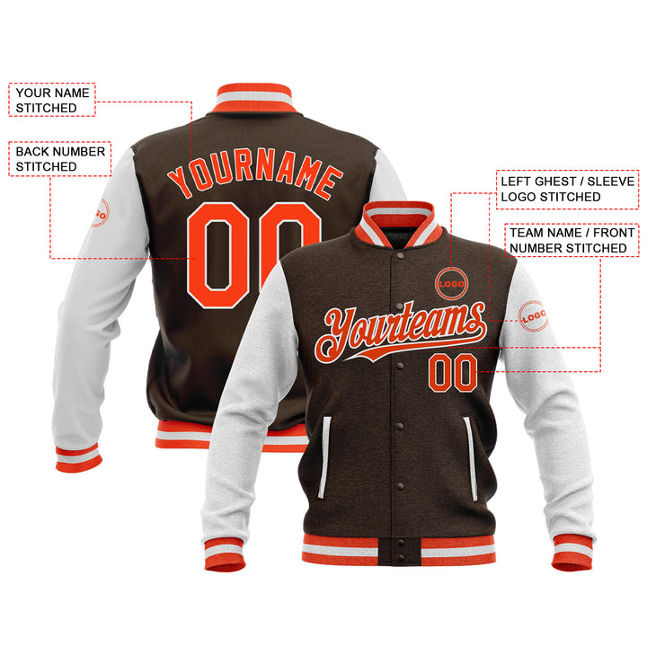 Custom Brown Orange-White Classic Style Two Tone Full-Snap Bomber Varsity Letterman Embroidered Jacket