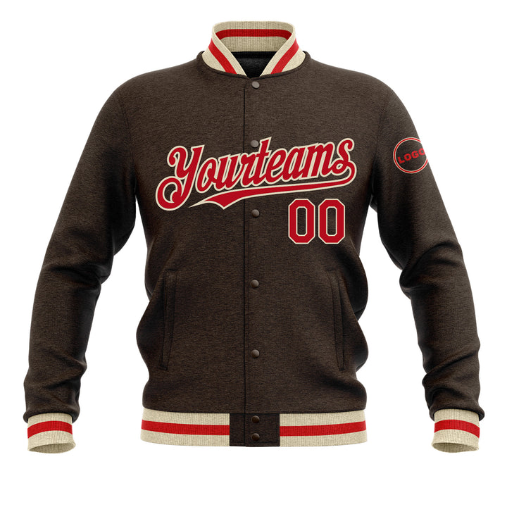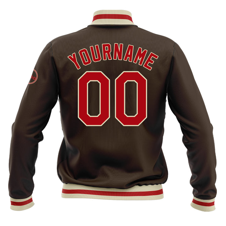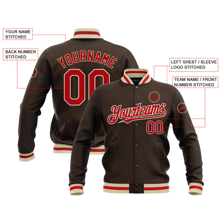 Custom Brown Red-Cream Classic Style Full-Snap Bomber Varsity Letterman Embroidered Jacket