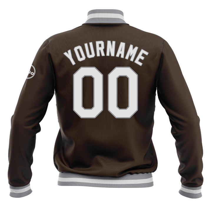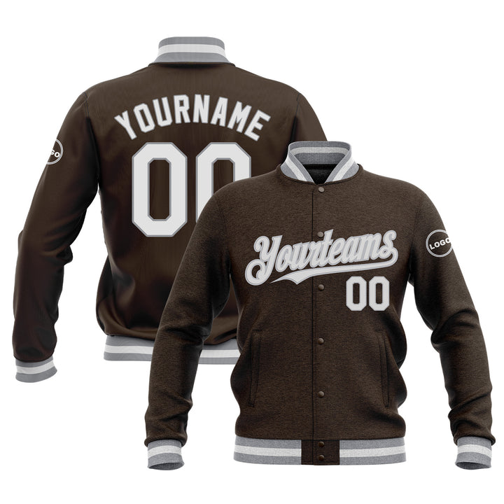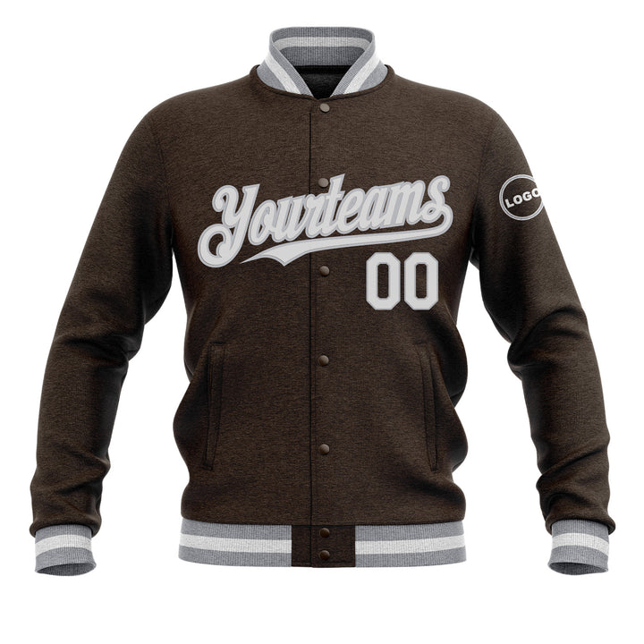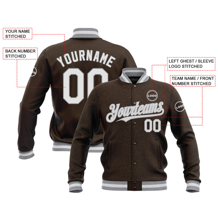 Custom Brown White-Gray Classic Style Full-Snap Bomber Varsity Letterman Embroidered Jacket