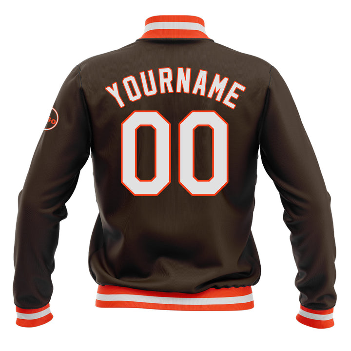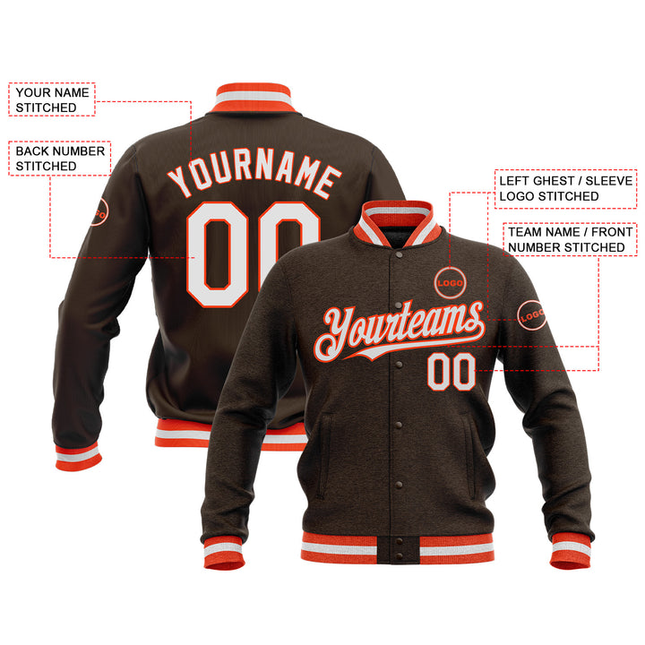 Custom Brown White-Orange Classic Style Full-Snap Bomber Varsity Letterman Embroidered Jacket
