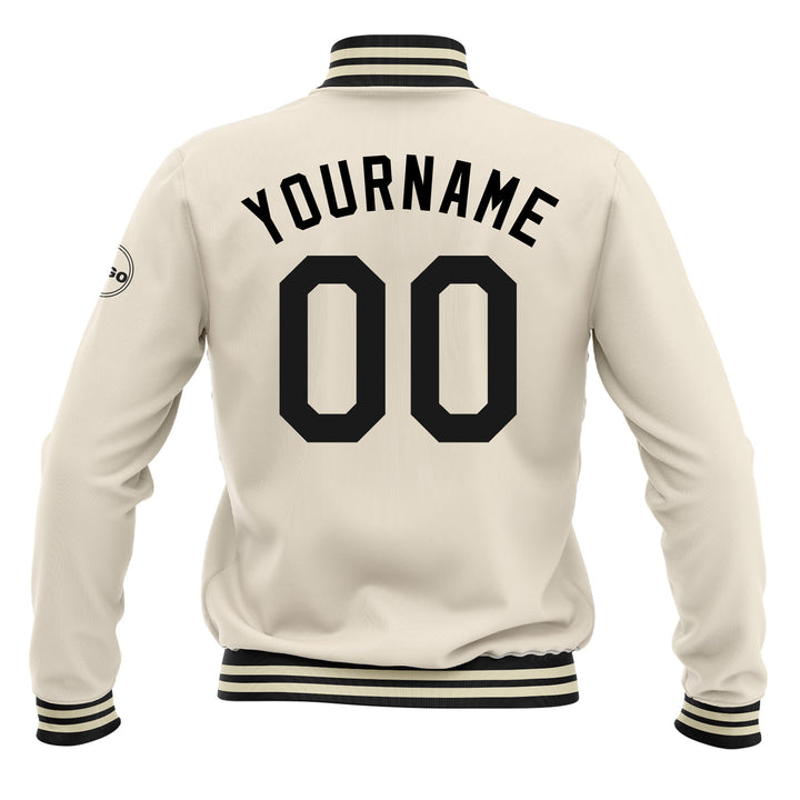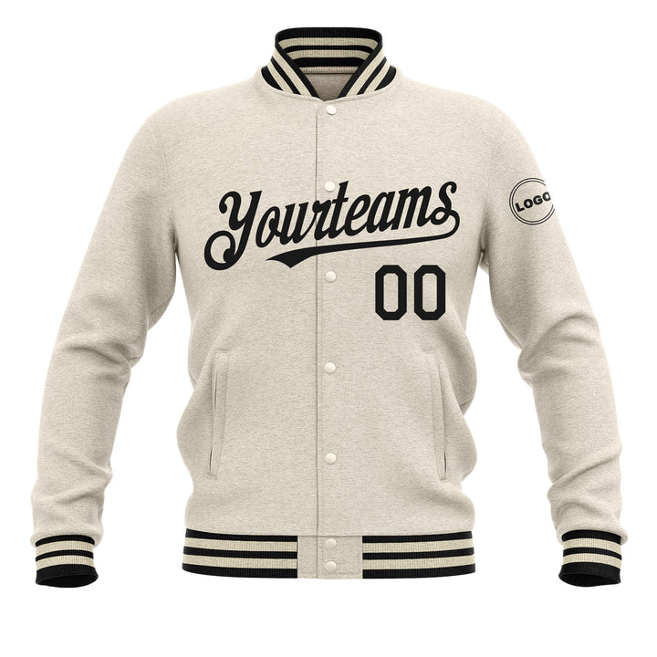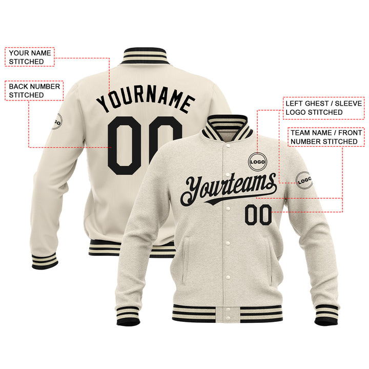 Custom Cream Black Classic Style Full-Snap Bomber Varsity Letterman Embroidered Jacket