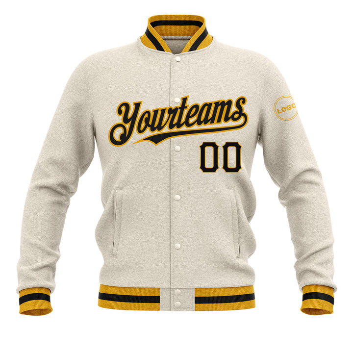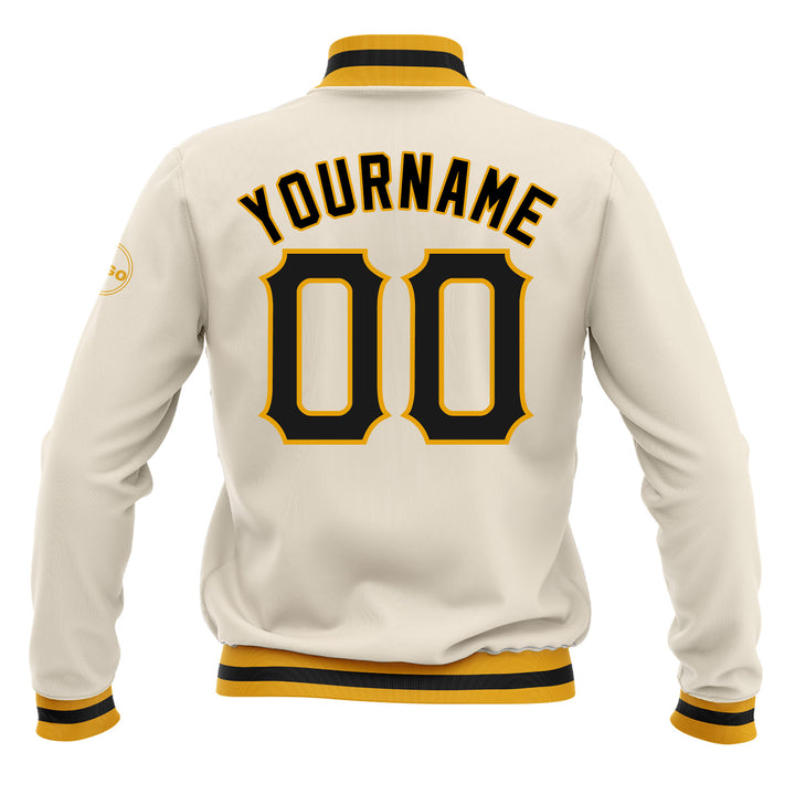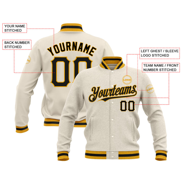 Custom Cream Black-Gold Classic Style Full-Snap Bomber Varsity Letterman Embroidered Jacket