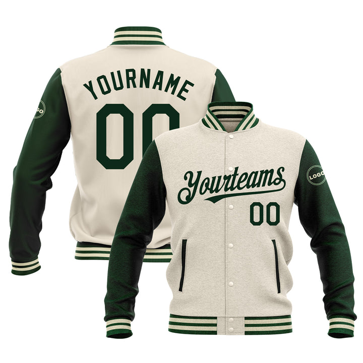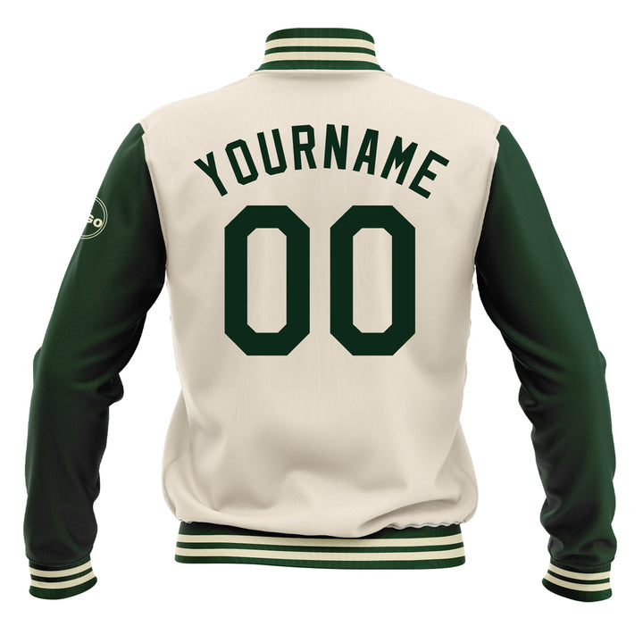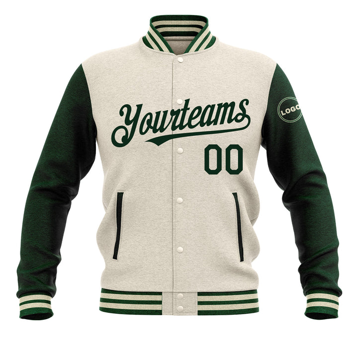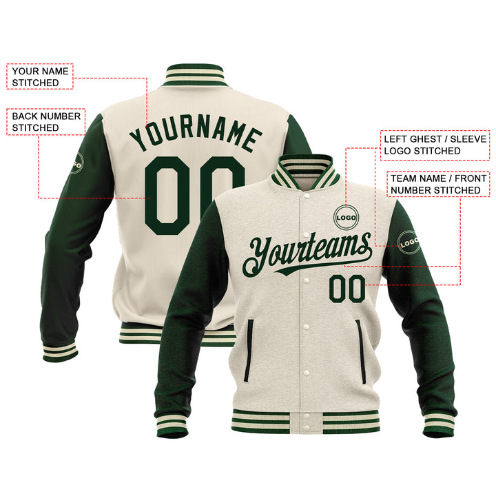 Custom Cream Green Classic Style Two Tone Full-Snap Bomber Varsity Letterman Embroidered Jacket