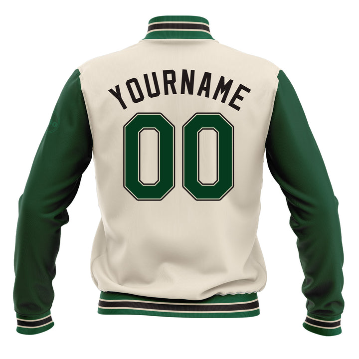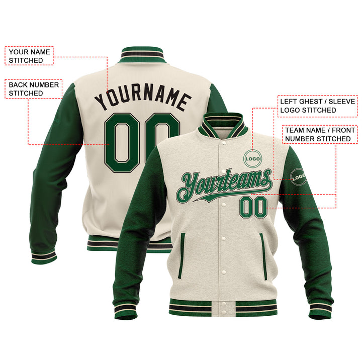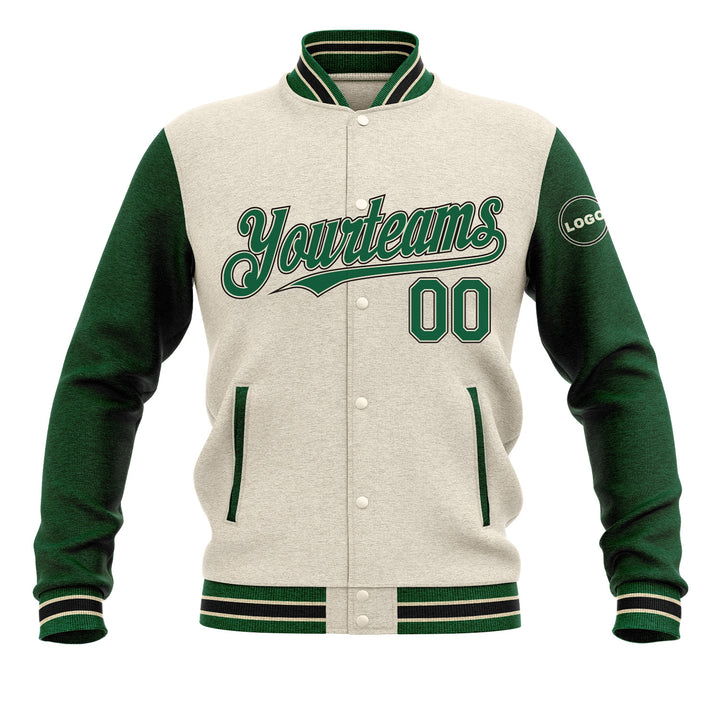 Custom Cream Kelly Green-Black Classic Style Two Tone Full-Snap Bomber Varsity Letterman Embroidered Jacket