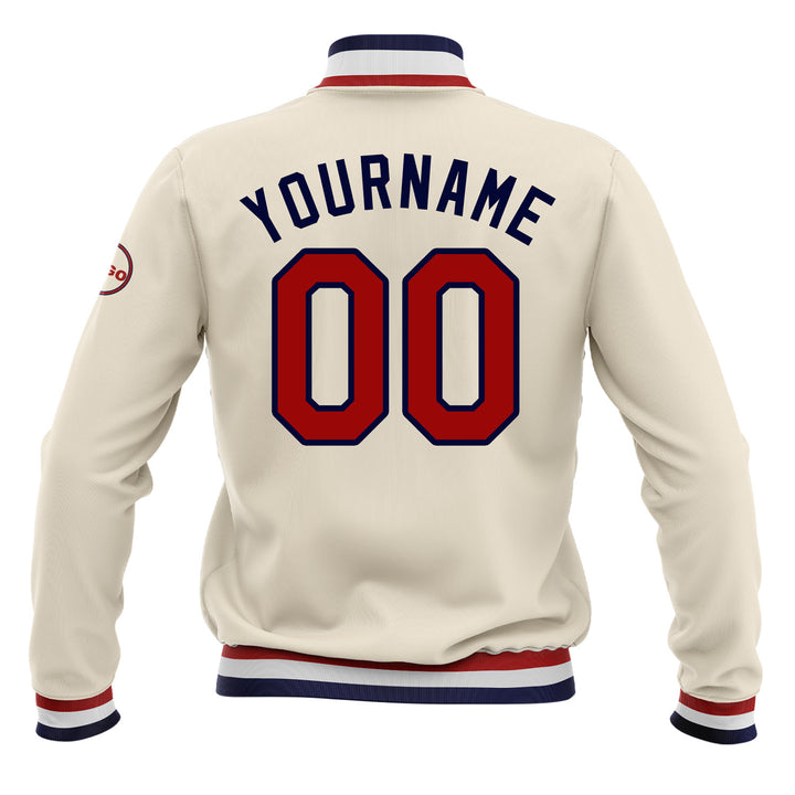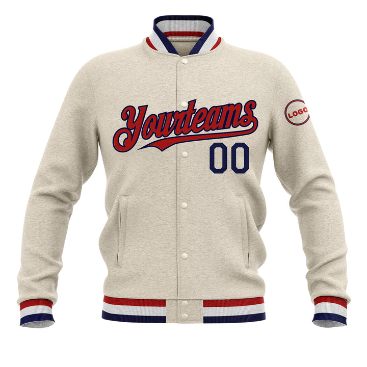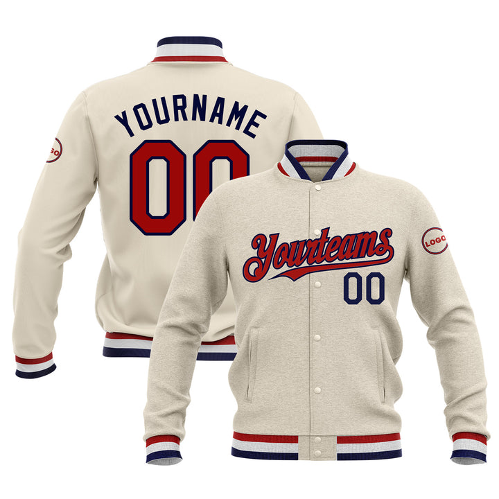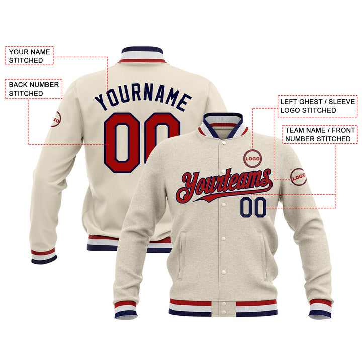 Custom Cream Red-Navy Classic Style Full-Snap Bomber Varsity Letterman Embroidered Jacket