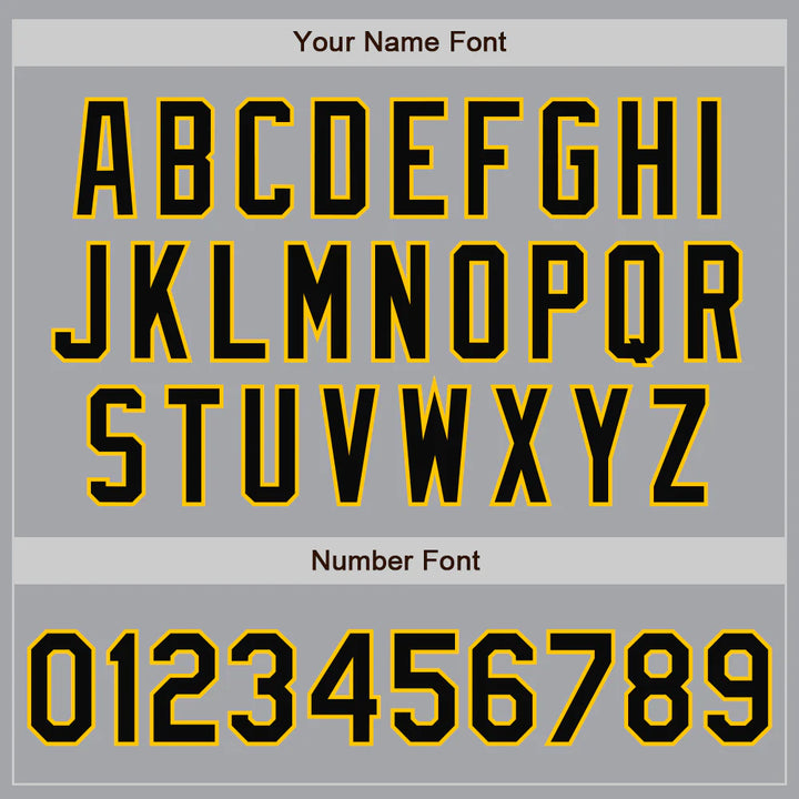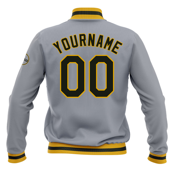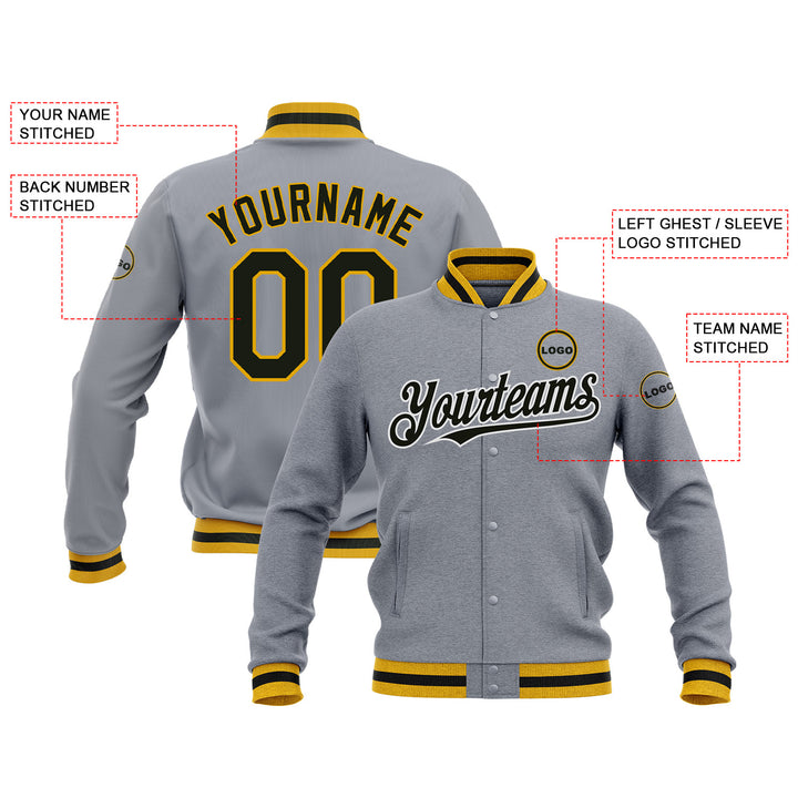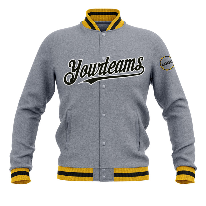 Custom Gray Black-Gold Full-Snap Bomber Varsity Letterman Embroidered Jacket