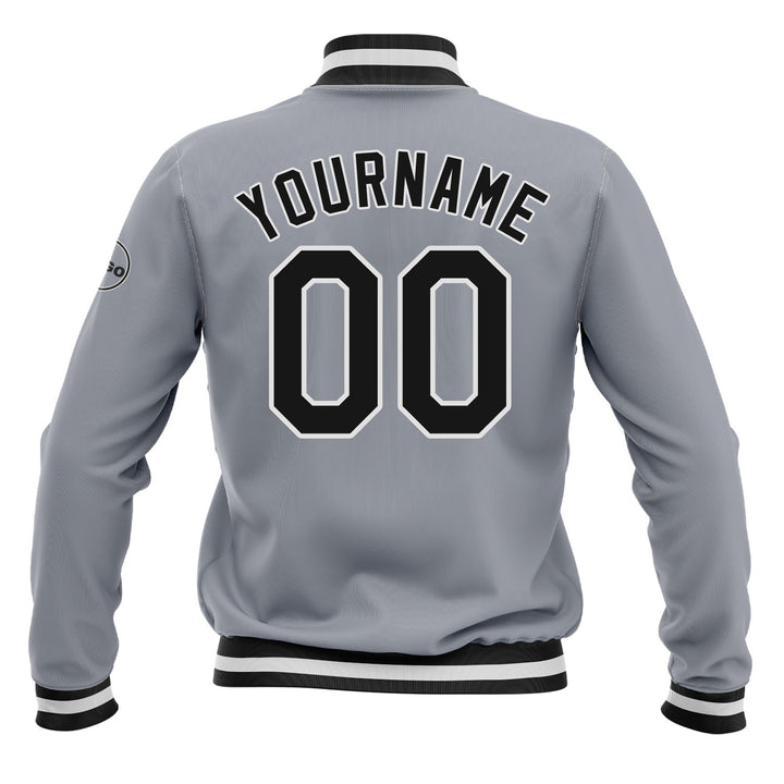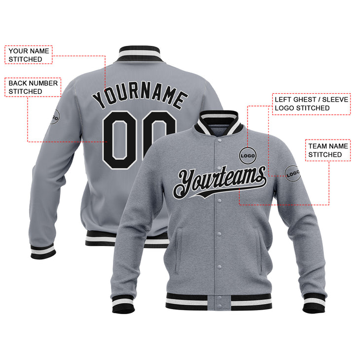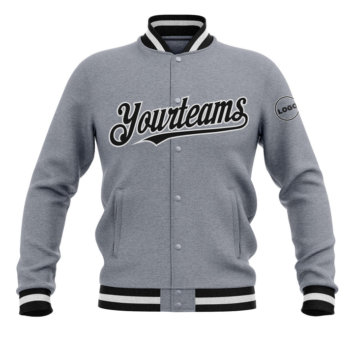 Custom Gray Black-White Full-Snap Bomber Varsity Letterman Embroidered Jacket