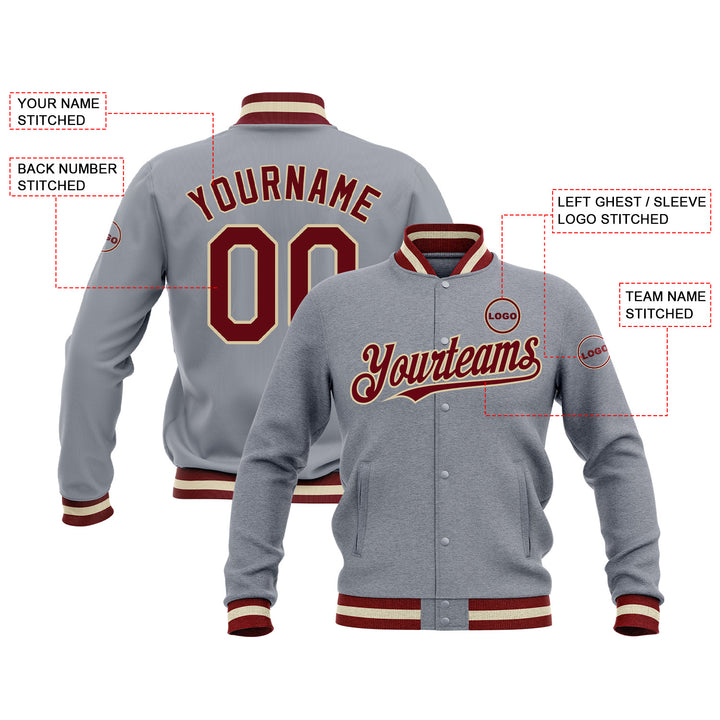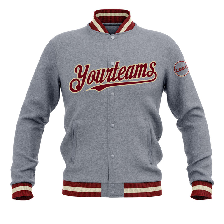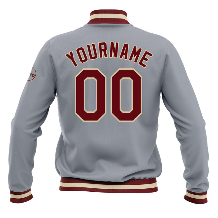 Custom Gray Maroon-Cream Bomber Varsity Letterman Embroidered Jacket