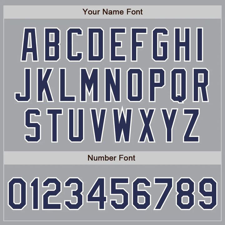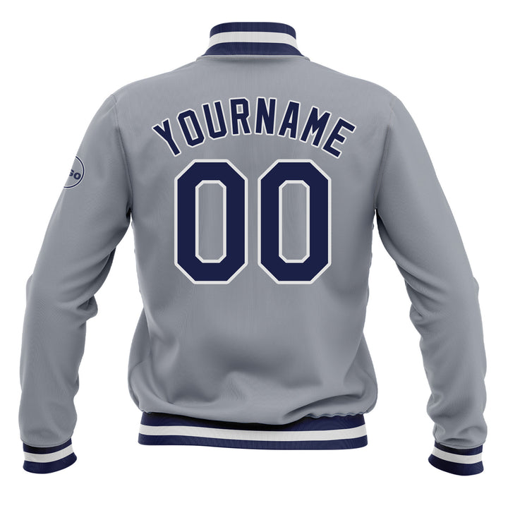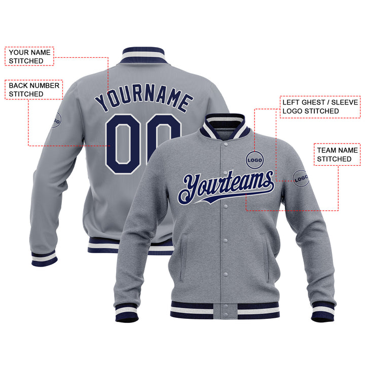 Custom Gray Navy-White Full-Snap Bomber Varsity Letterman Embroidered Jacket