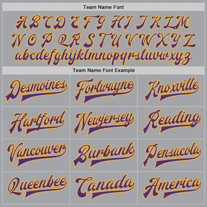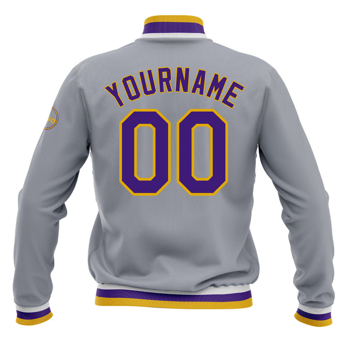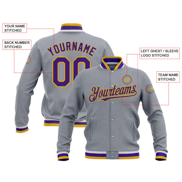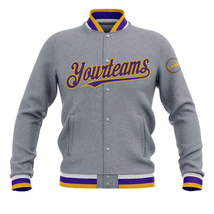 Custom Gray Purple-Gold Bomber Varsity Letterman Embroidered Jacket