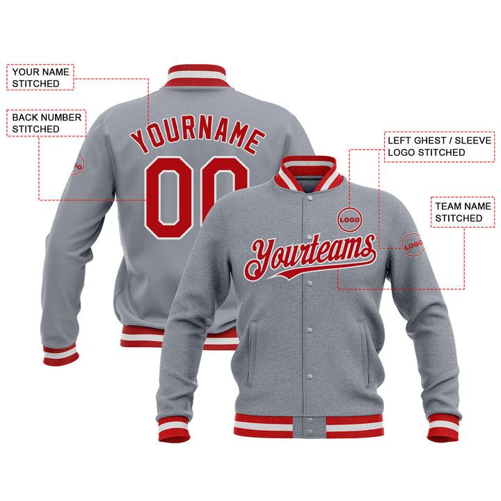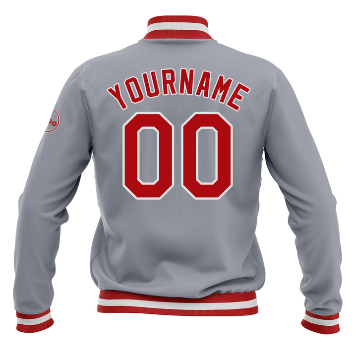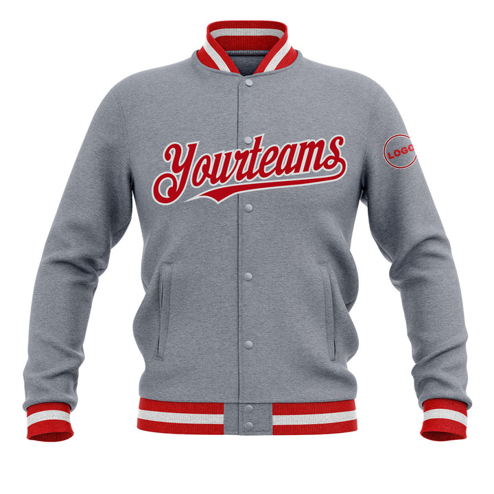 Custom Gray Red-White Bomber Varsity Letterman Embroidered Jacket