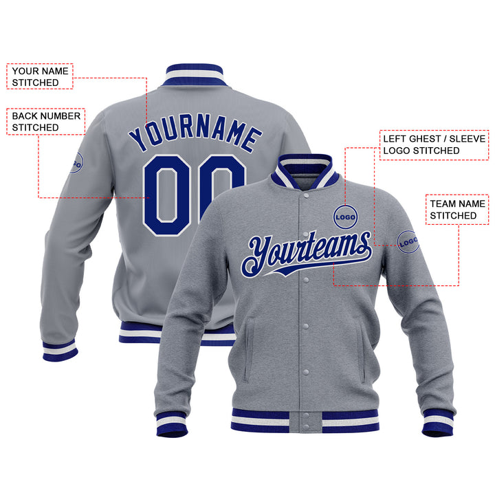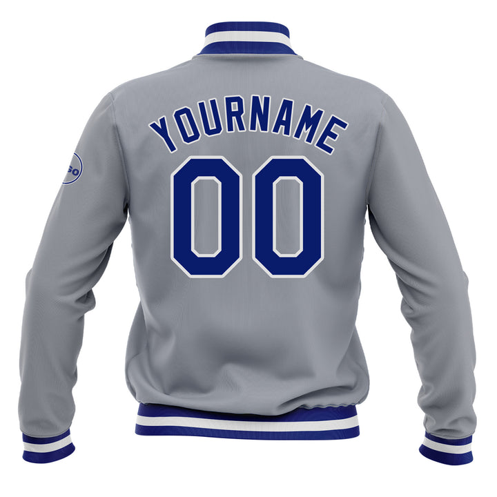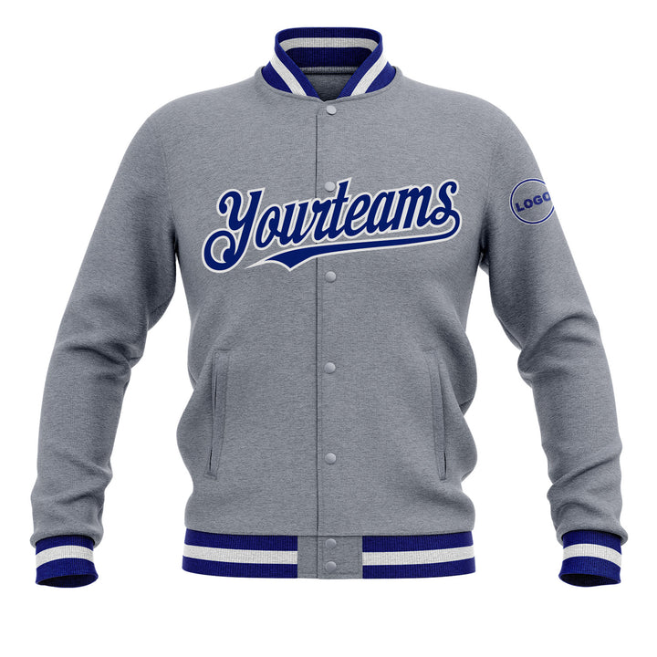 Custom Gray Royal-White Bomber Varsity Letterman Embroidered Jacket