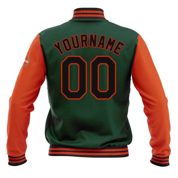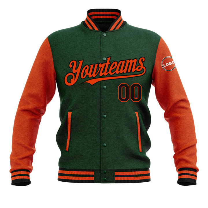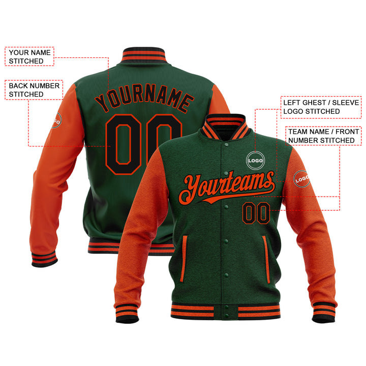 Custom Green Black-Orange Classic Style Two Tone Full-Snap Bomber Varsity Letterman Embroidered Jacket