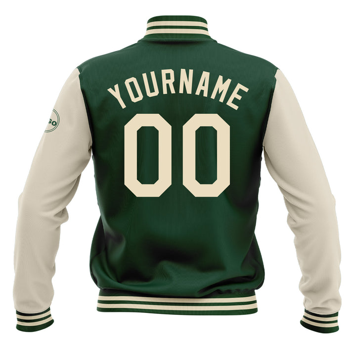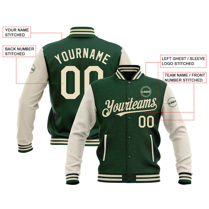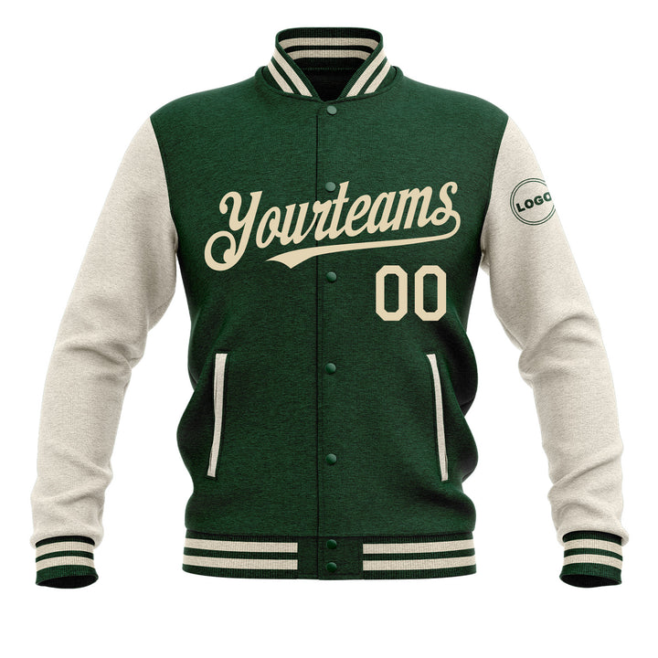 Custom Green Cream Classic Style Two Tone Full-Snap Bomber Varsity Letterman Embroidered Jacket