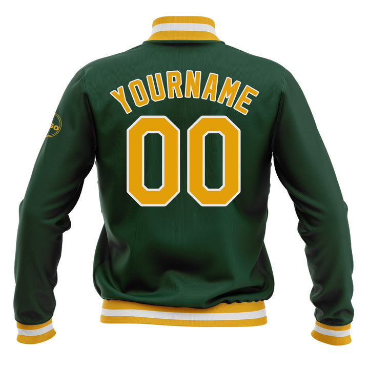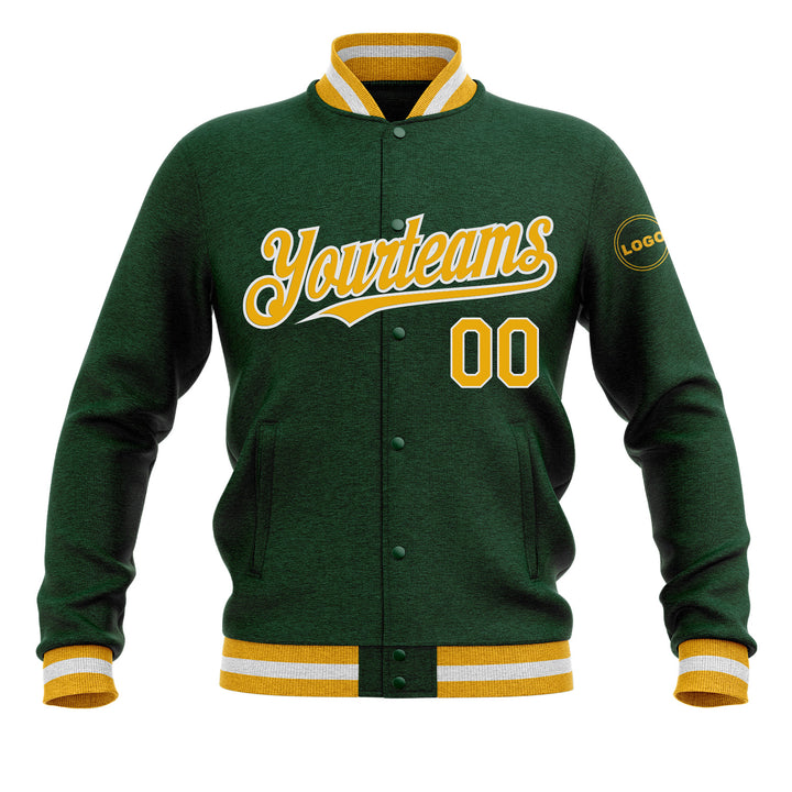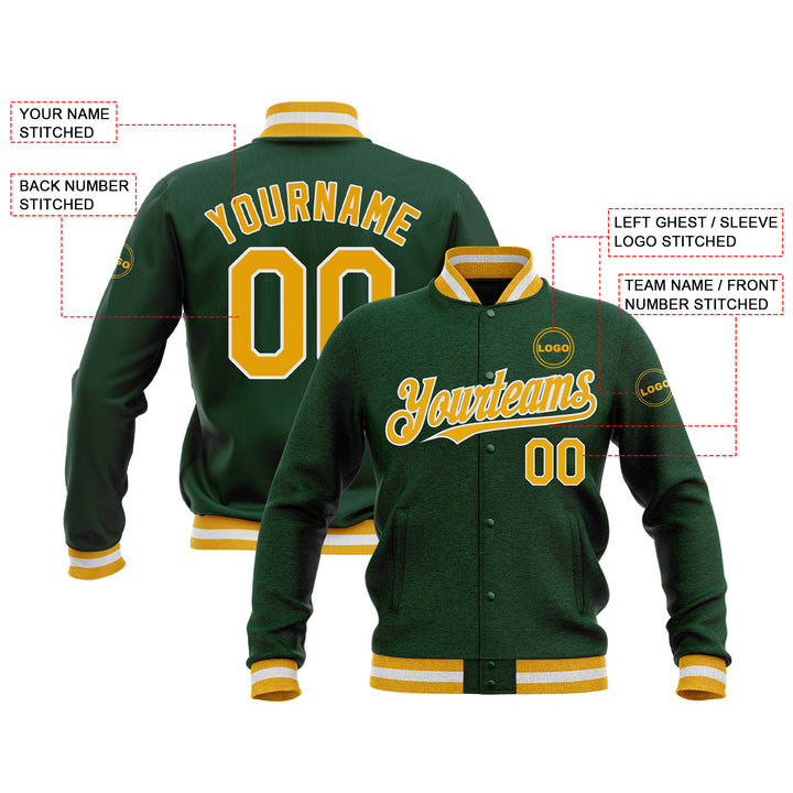 Custom Green Gold-White Classic Style Full-Snap Bomber Varsity Letterman Embroidered Jacket