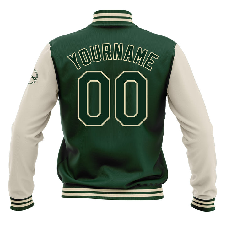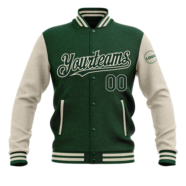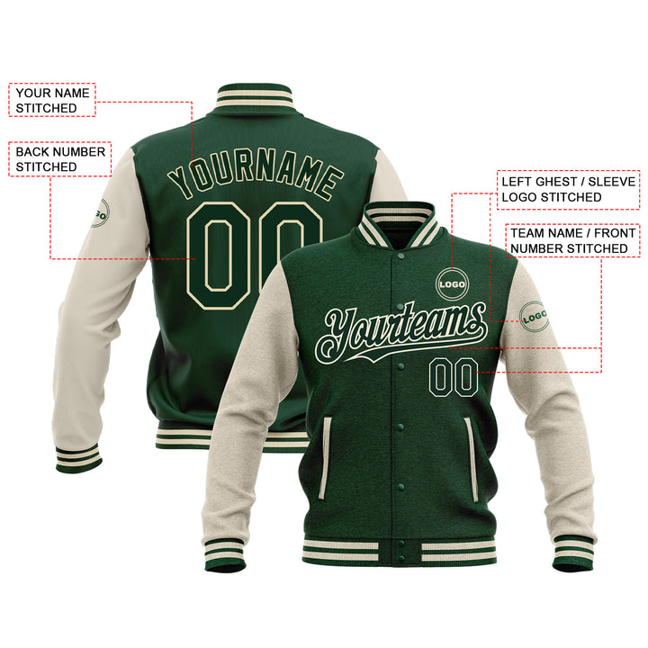 Custom Green Green-Cream Classic Style Two Tone Full-Snap Bomber Varsity Letterman Embroidered Jacket