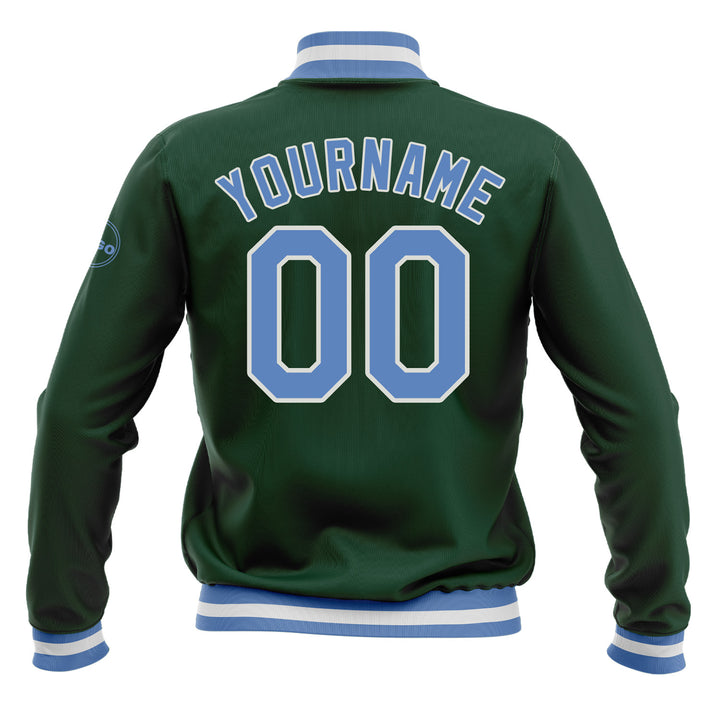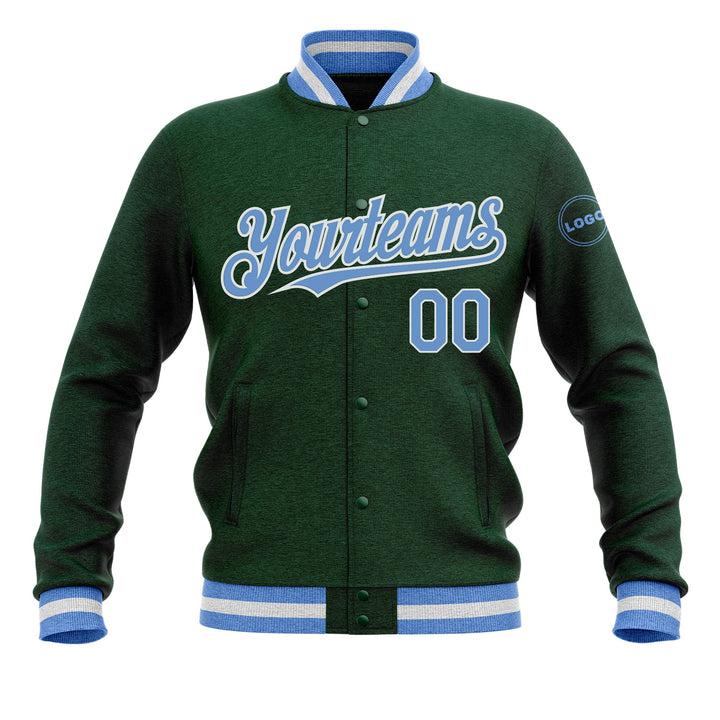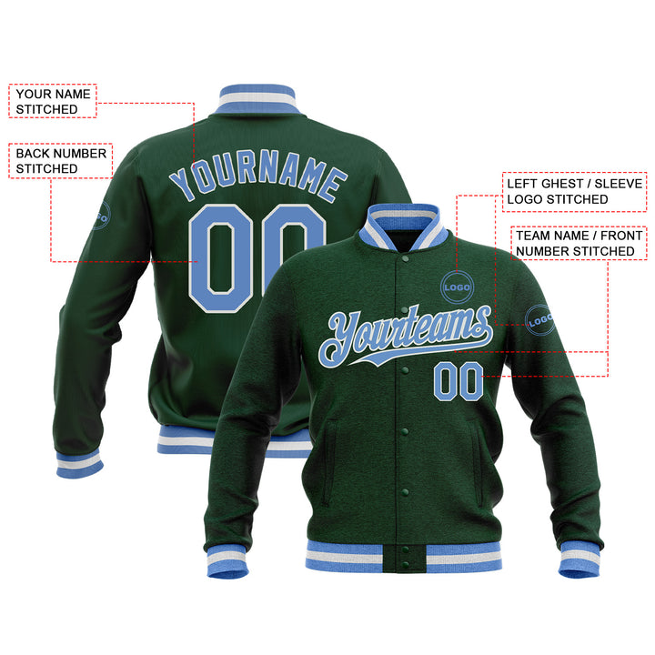 Custom Green Light Blue-White Classic Style Full-Snap Bomber Varsity Letterman Embroidered Jacket