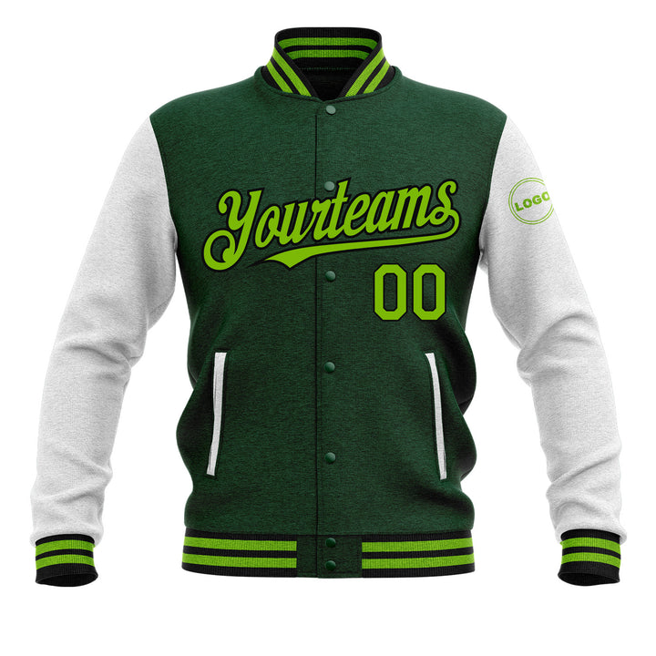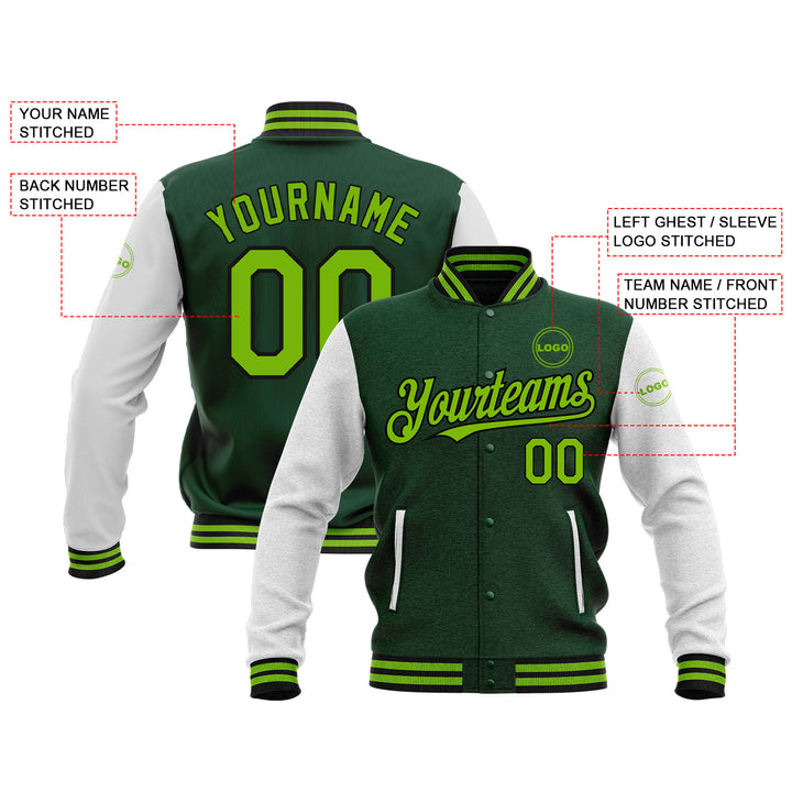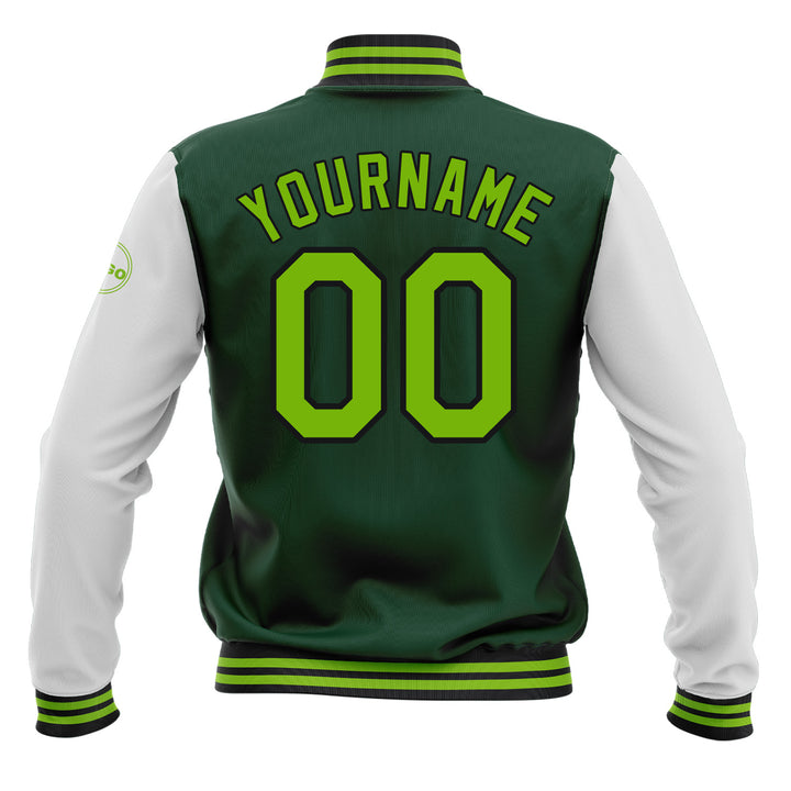 Custom Green Neon Green-Black Classic Style Two Tone Full-Snap Bomber Varsity Letterman Embroidered Jacket