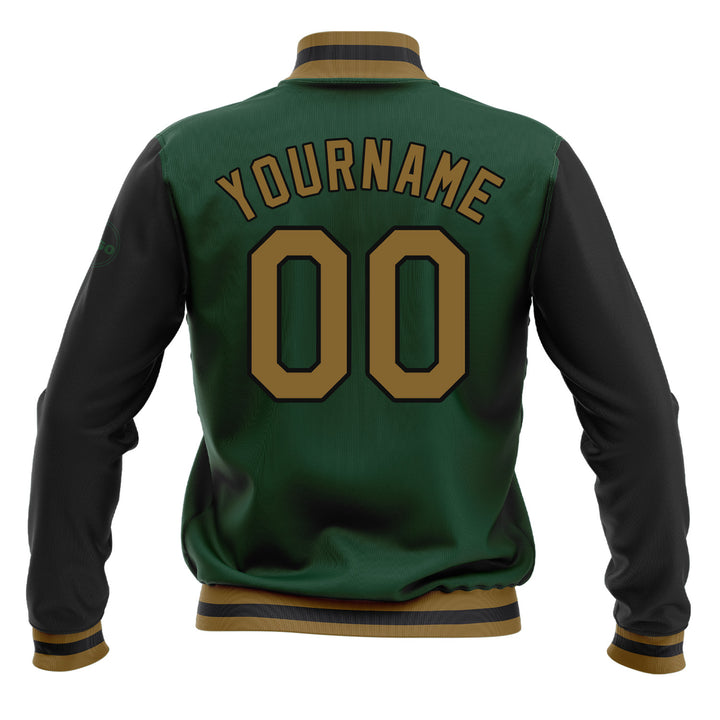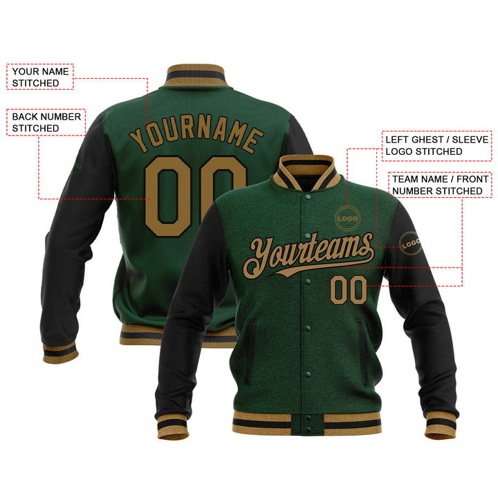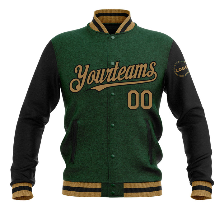 Custom Green Old Gold-Black Classic Style Two Tone Full-Snap Bomber Varsity Letterman Embroidered Jacket