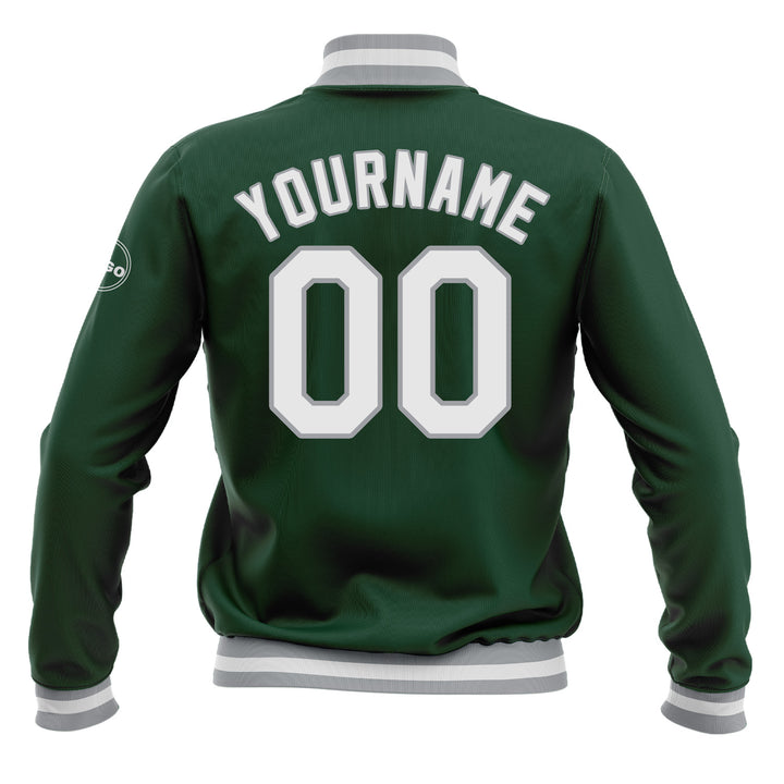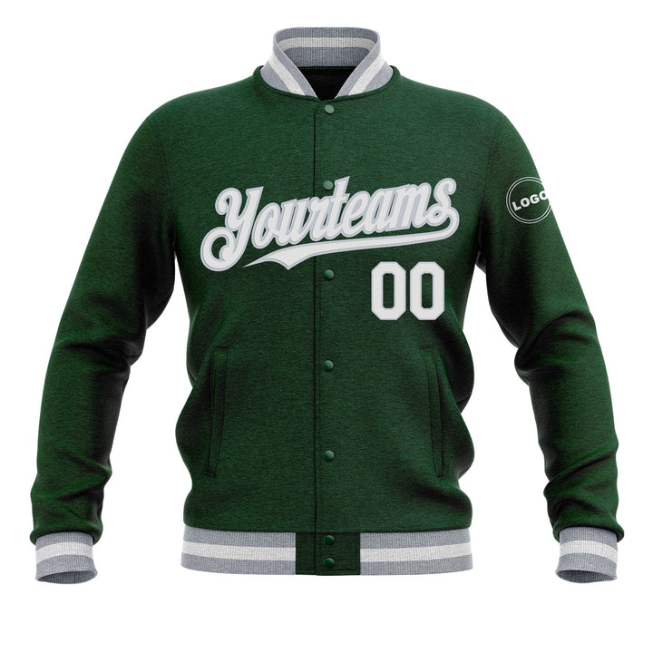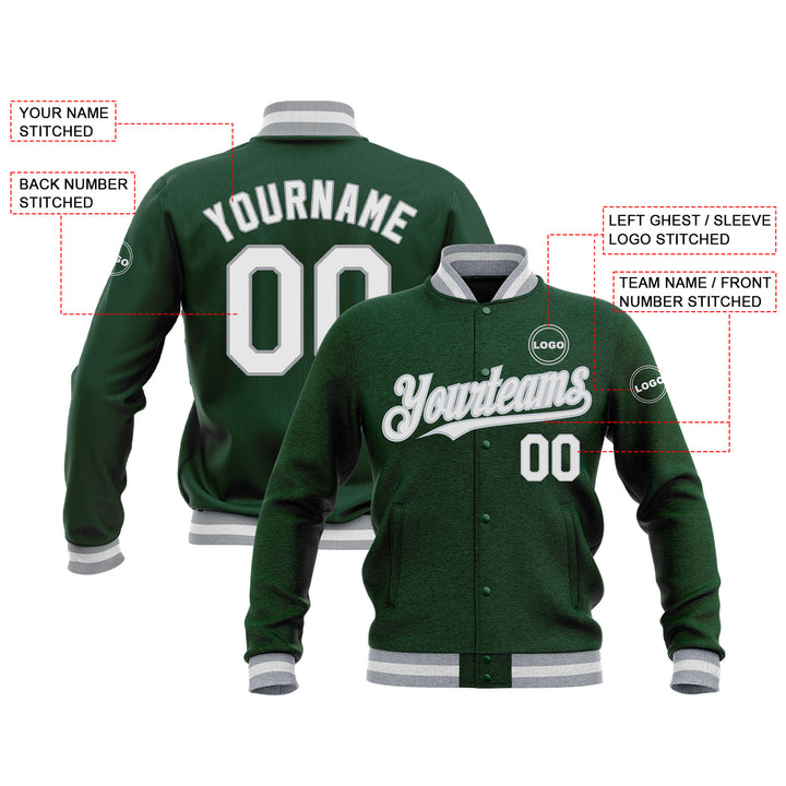Custom Green White-Gray Classic Style Full-Snap Bomber Varsity Letterman Embroidered Jacket