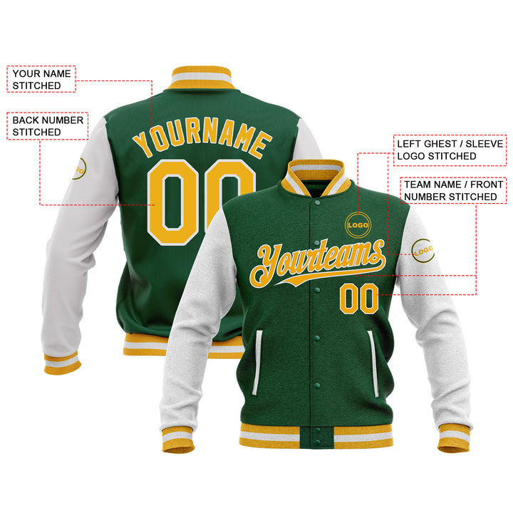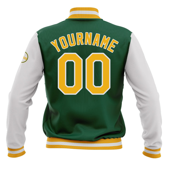 Custom Kelly Green Gold-White White Classic Style Two Tone Bomber Varsity Letterman Embroidered Jacket