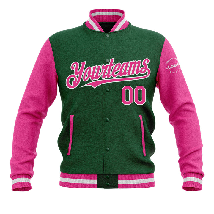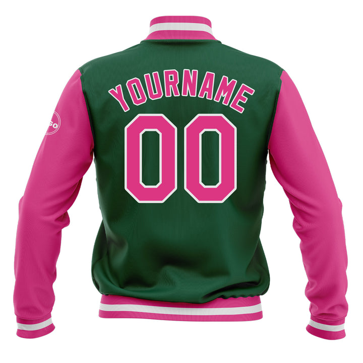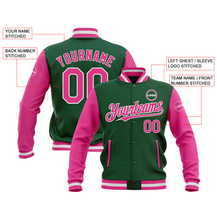 Custom Kelly Green Pink-White Classic Style Two Tone Bomber Varsity Letterman Embroidered Jacket