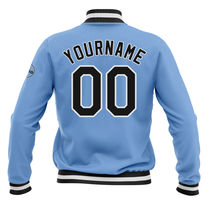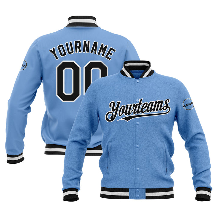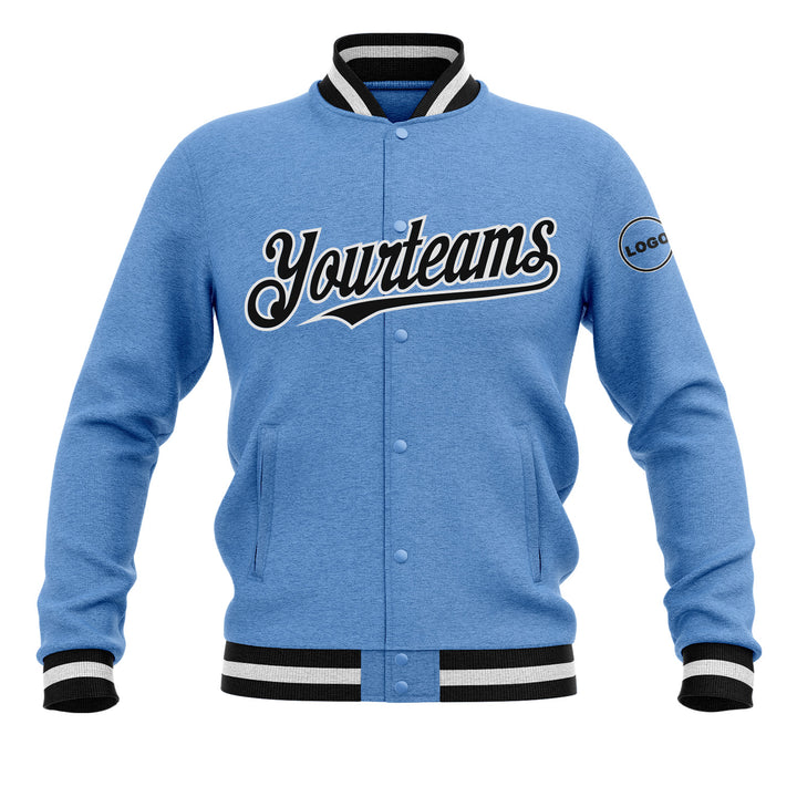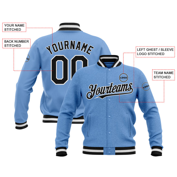 Custom Light Blue Black-White Bomber Varsity Letterman Embroidered Jacket
