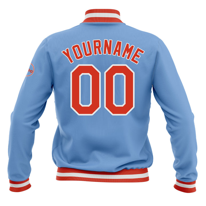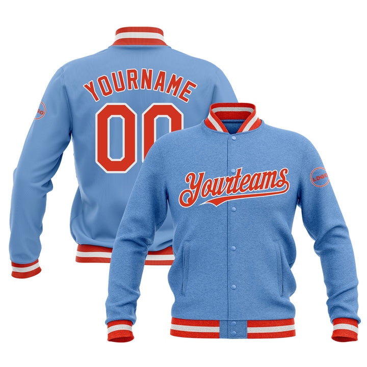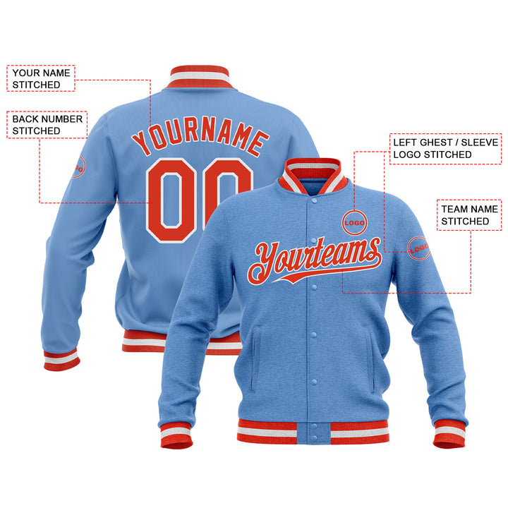Custom Light Blue Orange-White Bomber Varsity Letterman Embroidered Jacket