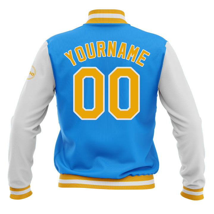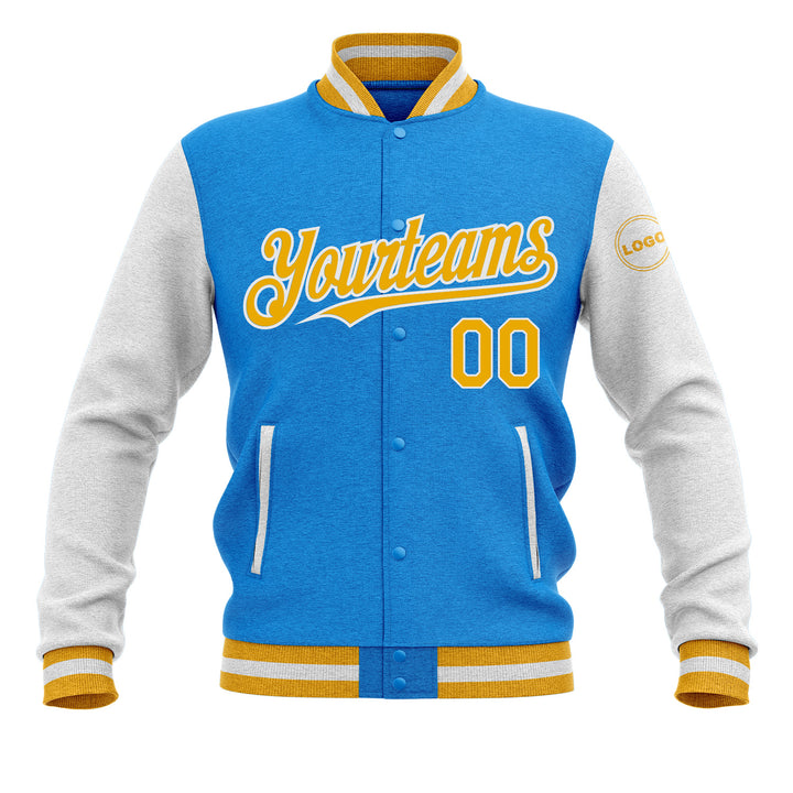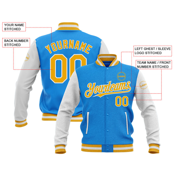 Custom Powder Blue Gold-White Classic Style Two Tone Bomber Varsity Letterman Embroidered Jacket