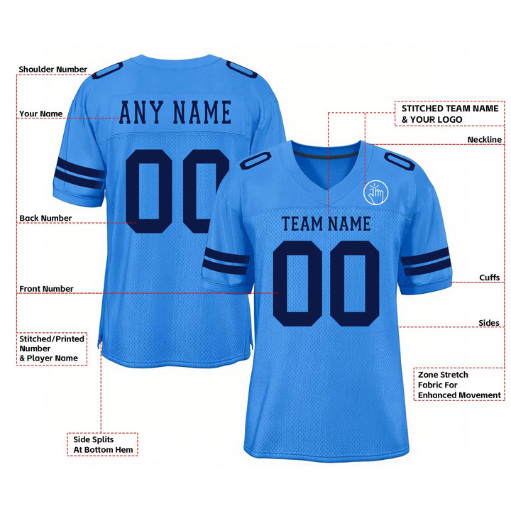 Custom Powder Blue Navy Mesh Classic Style Authentic Sports Football Jersey