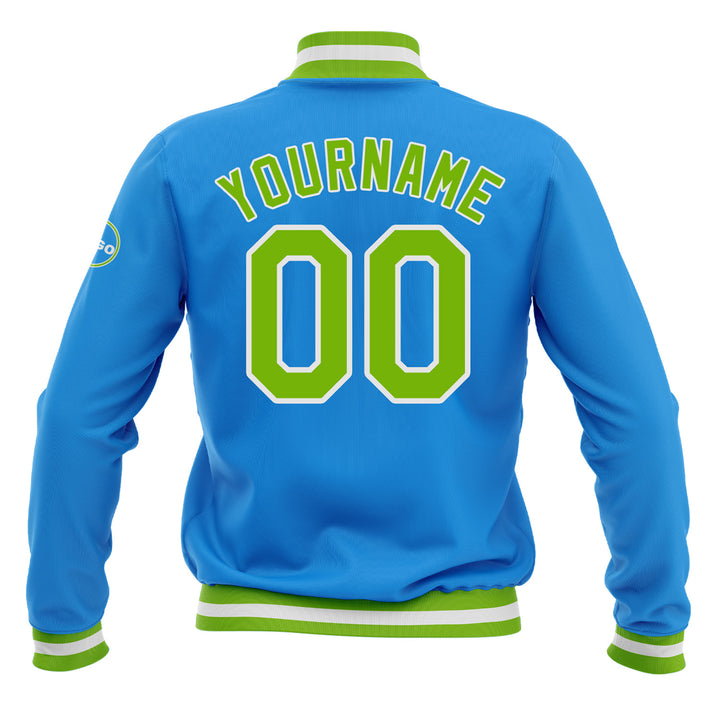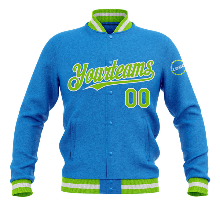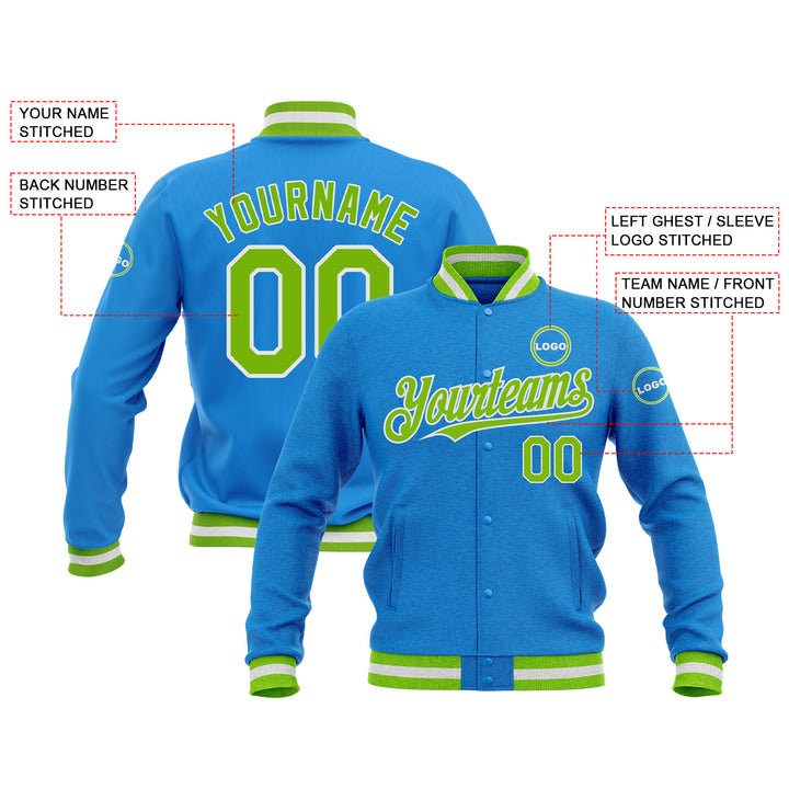 Custom Powder Blue Neon Green-White Classic Style Bomber Varsity Letterman Embroidered Jacket