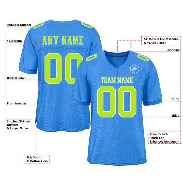 Custom Powder Blue Neon Green-White Mesh Classic Style Authentic Sports Football Jersey