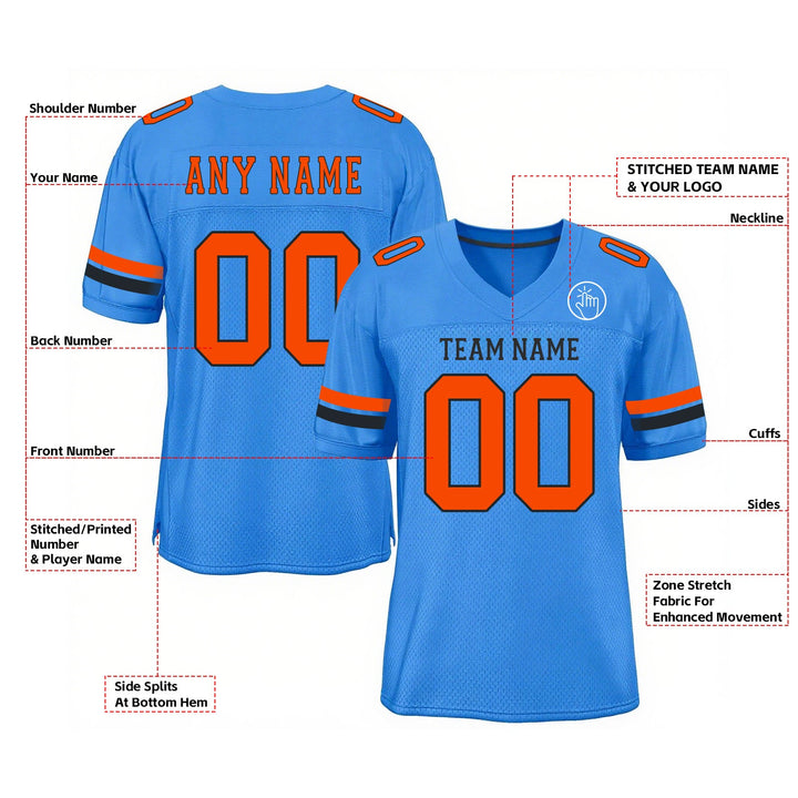 Custom Powder Blue Orange-Black Mesh Classic Style Authentic Sports Football Jersey