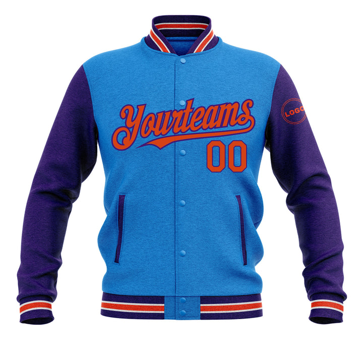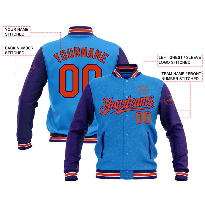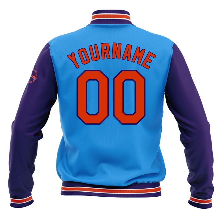 Custom Powder Blue Orange-Purple Classic Style Two Tone Bomber Varsity Letterman Embroidered Jacket