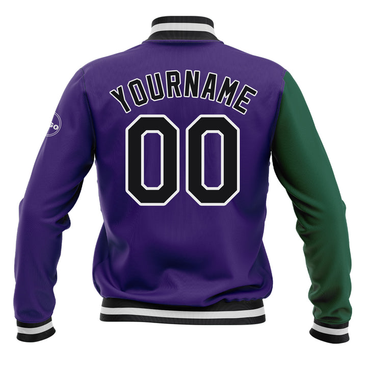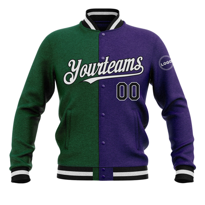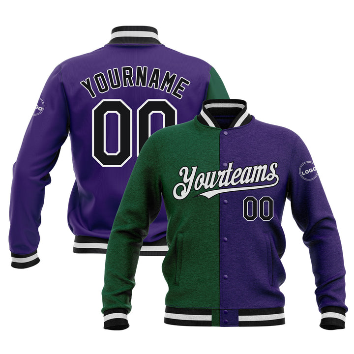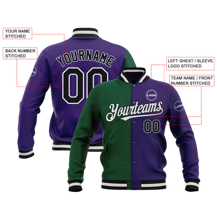Custom Purple Black Kelly Green Classic Style Split Fashion Classic Style Bomber Varsity Letterman Embroidered Jacket