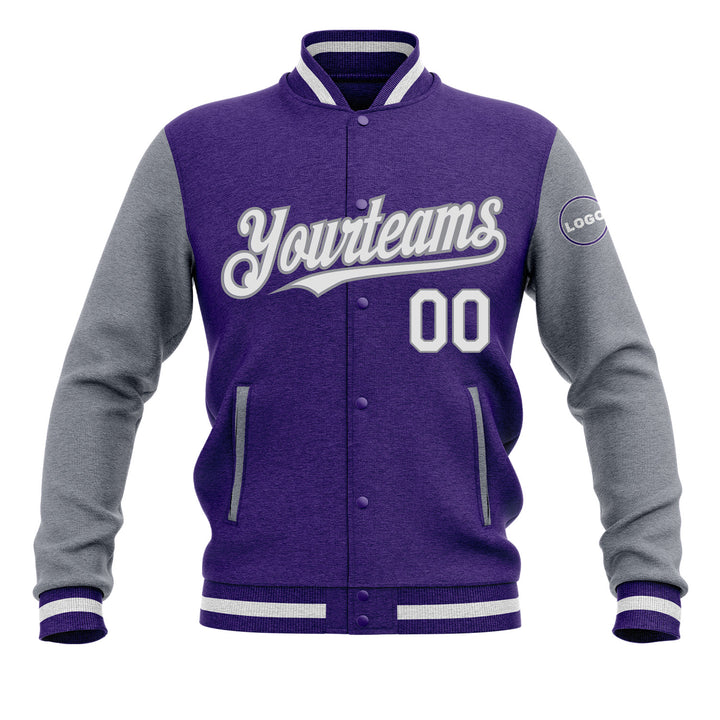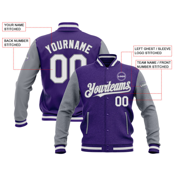 Custom Purple White-Gray Classic Style Bomber Varsity Letterman Embroidered Jacket